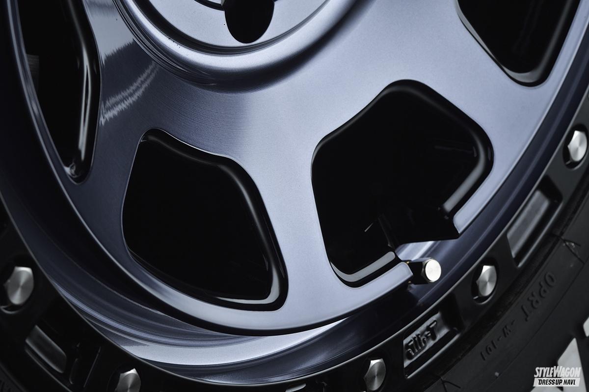 こだわったのは、過度な装飾を避けること。シンプルな造形だから、アグレッシブなコンケイブの力強さが際立ち、8個のスクエアホールが生み出す無骨感、トラッド感も引き立つ。センターパートの面積も大きいからパワフルで、大柄なボディとの相性も上々。リムフランジにはブランドとしてのアイコンである、リアルビードロック風デザインも採用。シンプルな分、このリムの存在感も映える。
