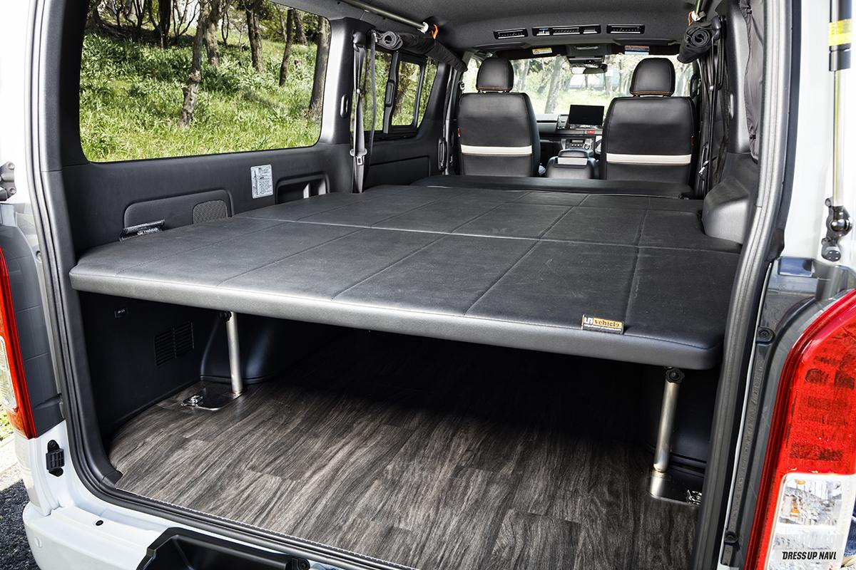 足まわり改善パーツ4点と車中泊おすすめアイテム15点が標準装備となった「快適車中泊パッケージ」。20ミリウレタン入りのベッドキットを中心に、遮光パッドやシートカバーなど居心地の良さを増す装備を設定。またフロントシート下のフェリソニ防音材やカーゴマットによって車内の静音化を図っている点も特徴だ。さらに、オプションメニューでは2段ベッドやサブバッテリーシステム、FFヒーター、ルーフパネルの防音断熱処理を用意。ハイエースをより居住性の高い空間へと変貌させることができる。
