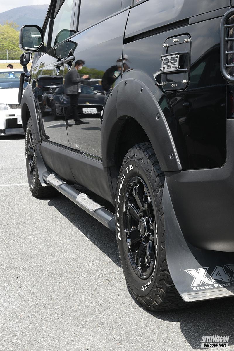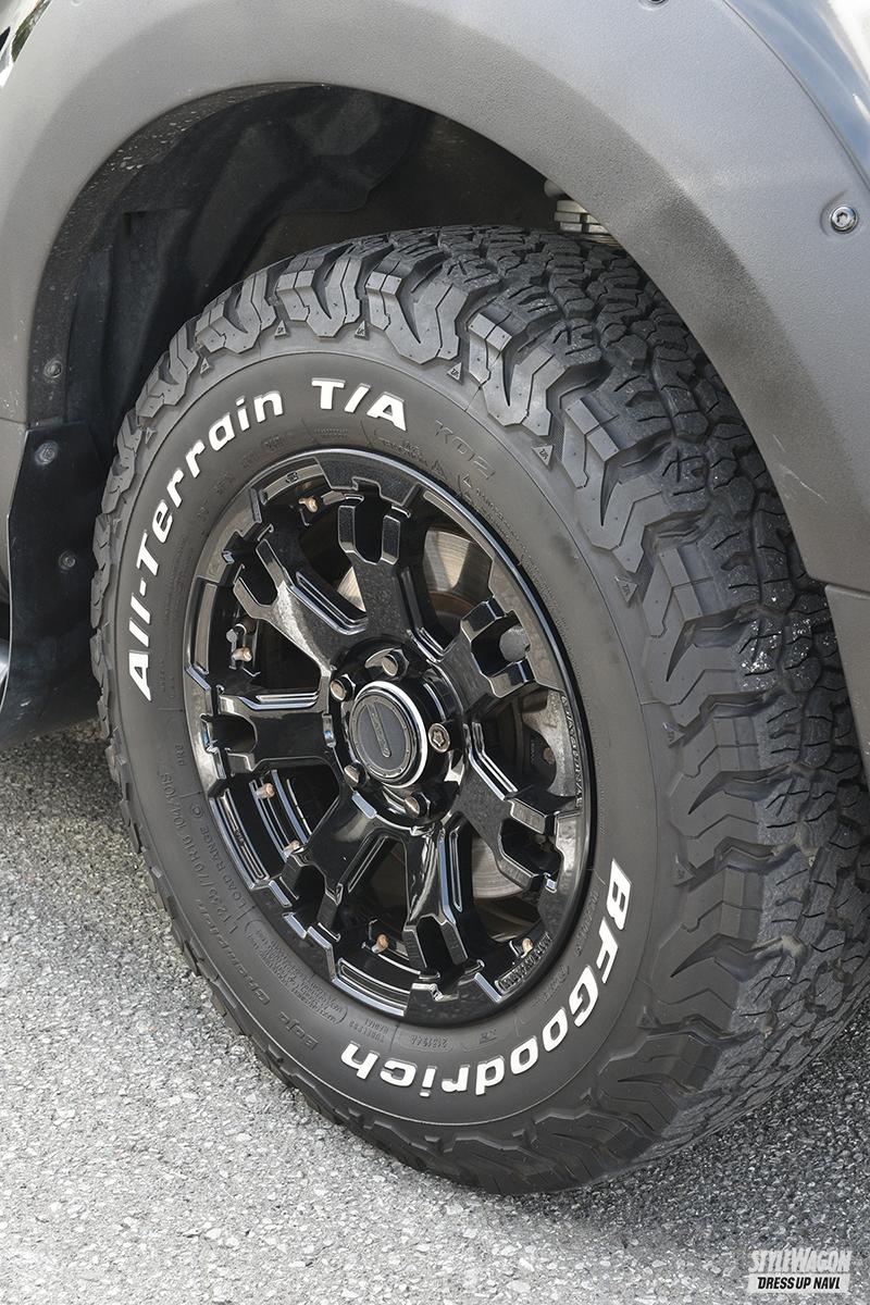 歴代の愛車にはすべてレイズのホイールを履いていたという、筋金入りのレイズファン。「いつも自分好みのホイールを出してくれるから嬉しいです(笑)」と宮川さん。デリカD:5はチームデイトナのFDX F7をチョイス。力強さを感じる骨太スポークデザインが、オーナーの感性にマッチ。またD:5にジャストフィットなサイズの設定があったのも選んだ理由である。タイヤはオフロードの王道、BFグッドリッチのオールテレーン。タフでワイルドな足元をゲット。