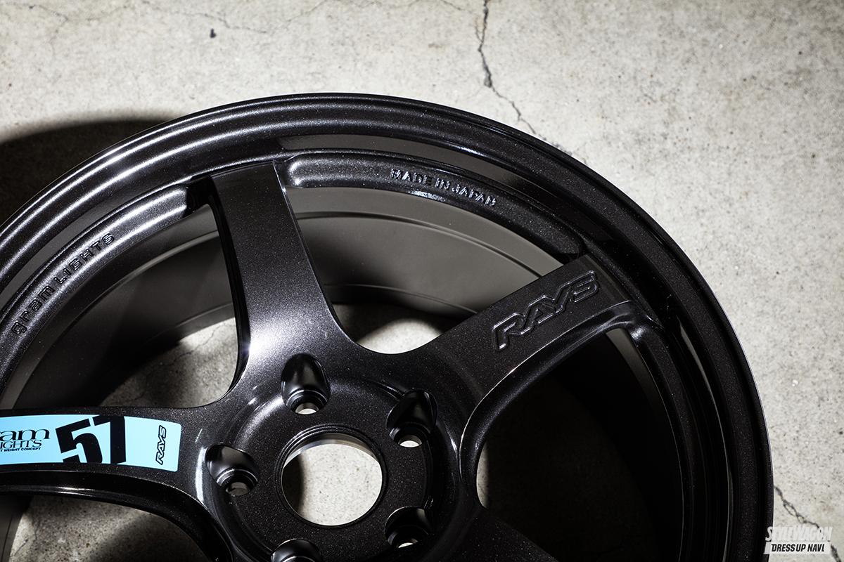 57CRスペックDはドリフト競技を視野に入れたモデルなため、設定されるのは攻めたサイズのみ。そこで同時に発売されたのが、よりマイルドなサイズの履かせやすいストリート仕様、57CRスペックMだ。ディスクカラーはツヤのあるスーパーダークガンメタで、スパルタンすぎず、映え度も上々なフィニッシュを実現。汚れの付着を抑え、汚れてもカンタンに落とせる仕様とするなどメンテナンス性にも配慮した。Dとの差別化のため、ステッカーは洗練のブルーに。