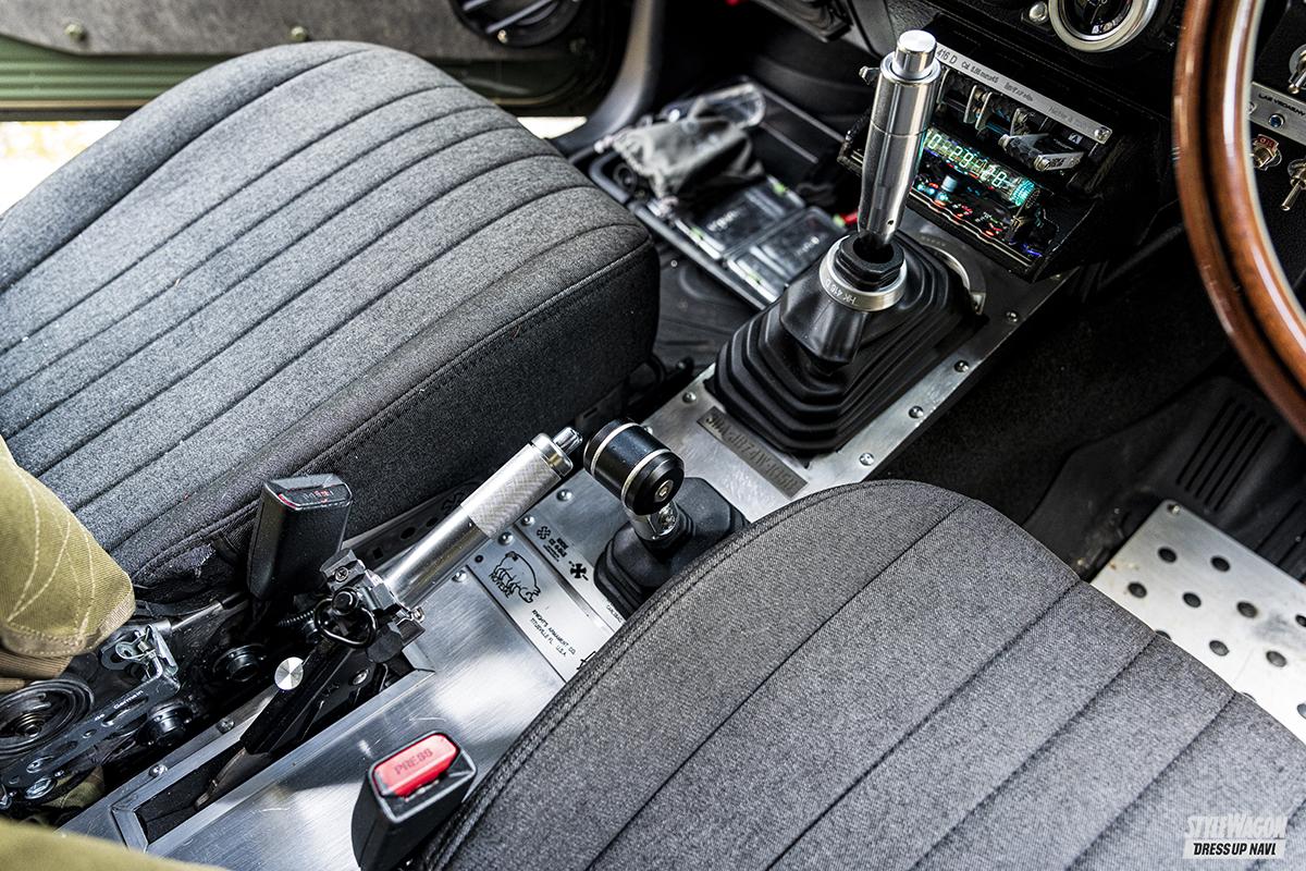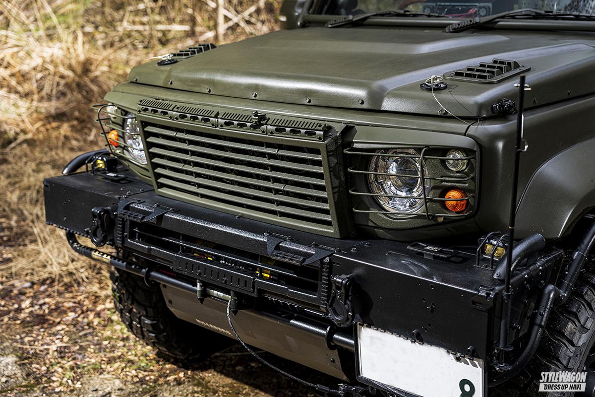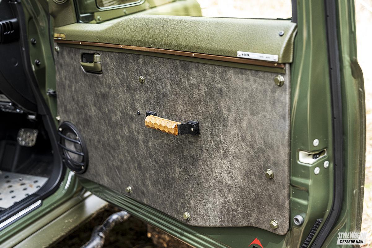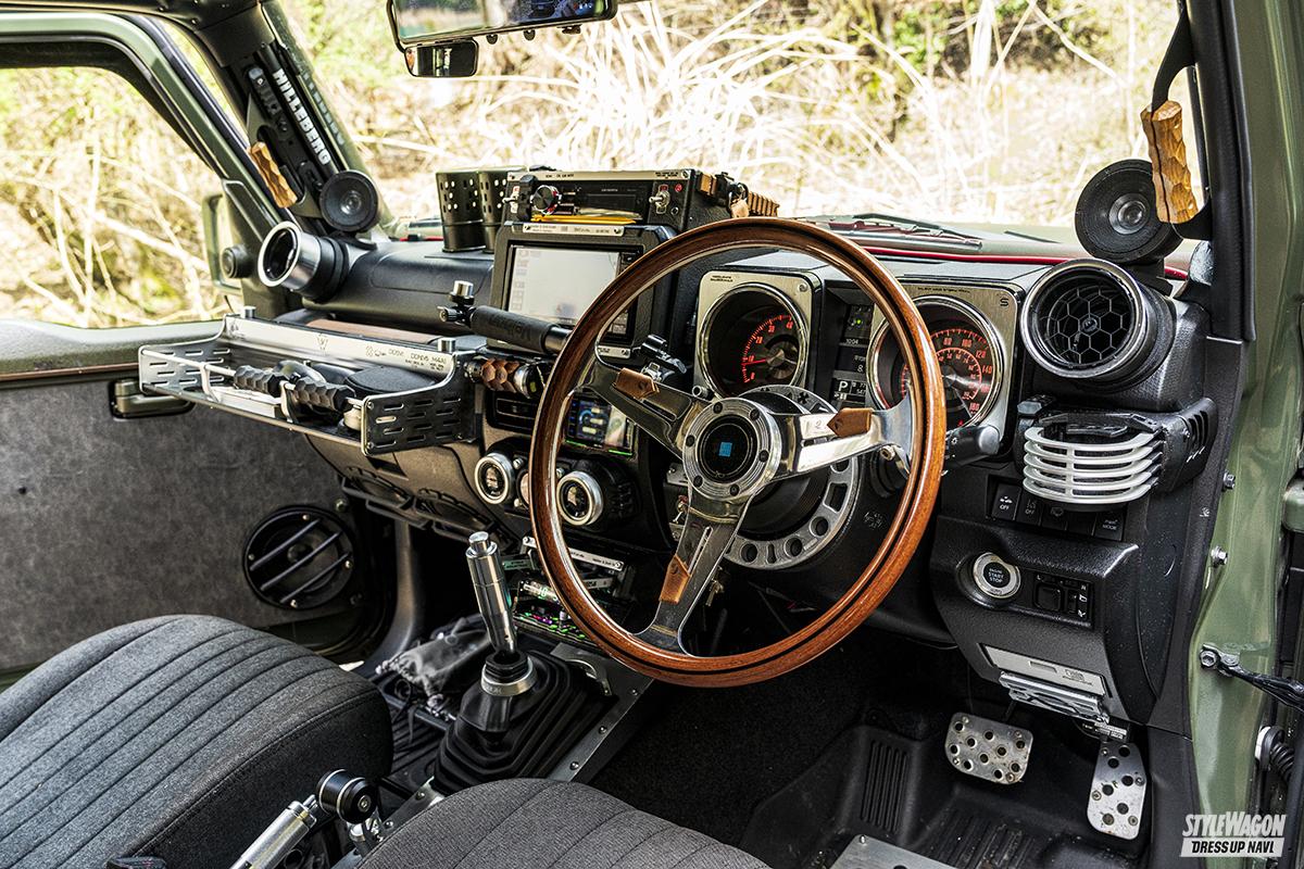 カスタムされていない所を探すのが難しいくらい内外装の至る所に手が入っているKoinさんのジムニーシエラ。エクステリアは購入後すぐにボンネット、グリル、バンパーをダムドに交換したが、同じ仕様が増えたため、カスタムをスタート。何と言ってもスゴイのは、シエラのカスタムのほとんどが自作であるという点。ホームセンターで購入したアイテムやキャンプ用品などを材料に、自分で加工して仕上げていく。それは普通に手に入る素材を使いながらオリジナルな料理に仕上げていく、まさに料理人ならではの「創作する」という部分につながる。それがクルマという素材で展開されているのだ。しかもカスタムの方向性にブレがないので、色々な物が付いていても「機能のため」、「必要だから」と思わせる統一感や説得力がある。