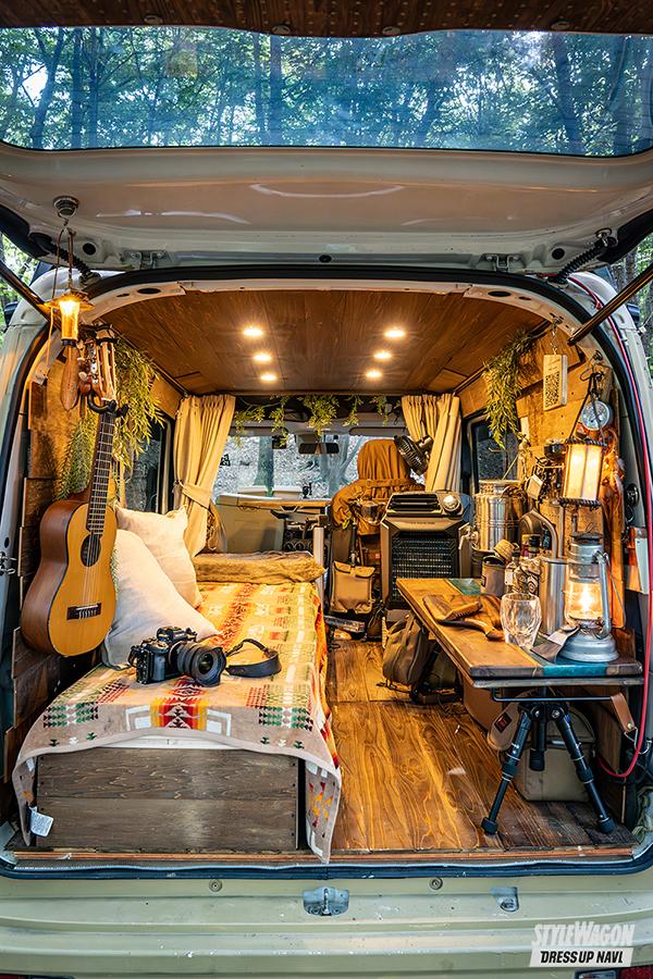 そんなりょうすけさんの相棒はマツダ・スクラム。「購入1カ月後のキャンプのイベントに間に合わせる」べく、仕事終わりに、時には深夜3時まで作業したDIY製作車だ。
