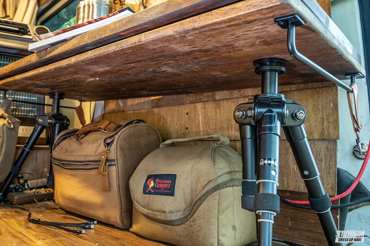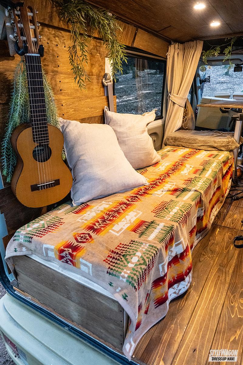 車外はローラーと刷毛によるオールペン仕様、車内はウッド仕様でコーディネイトと、超個性的なのはDIYによるものだから。自作のベッドも注目だが、ユニークなのはベッドの対面にあるテーブル。三脚を足代わりにしたオーナーの自作品なのだ。高さ調整も当然自由。お酒を並べ、楽しい夜の時間を過ごすのである。