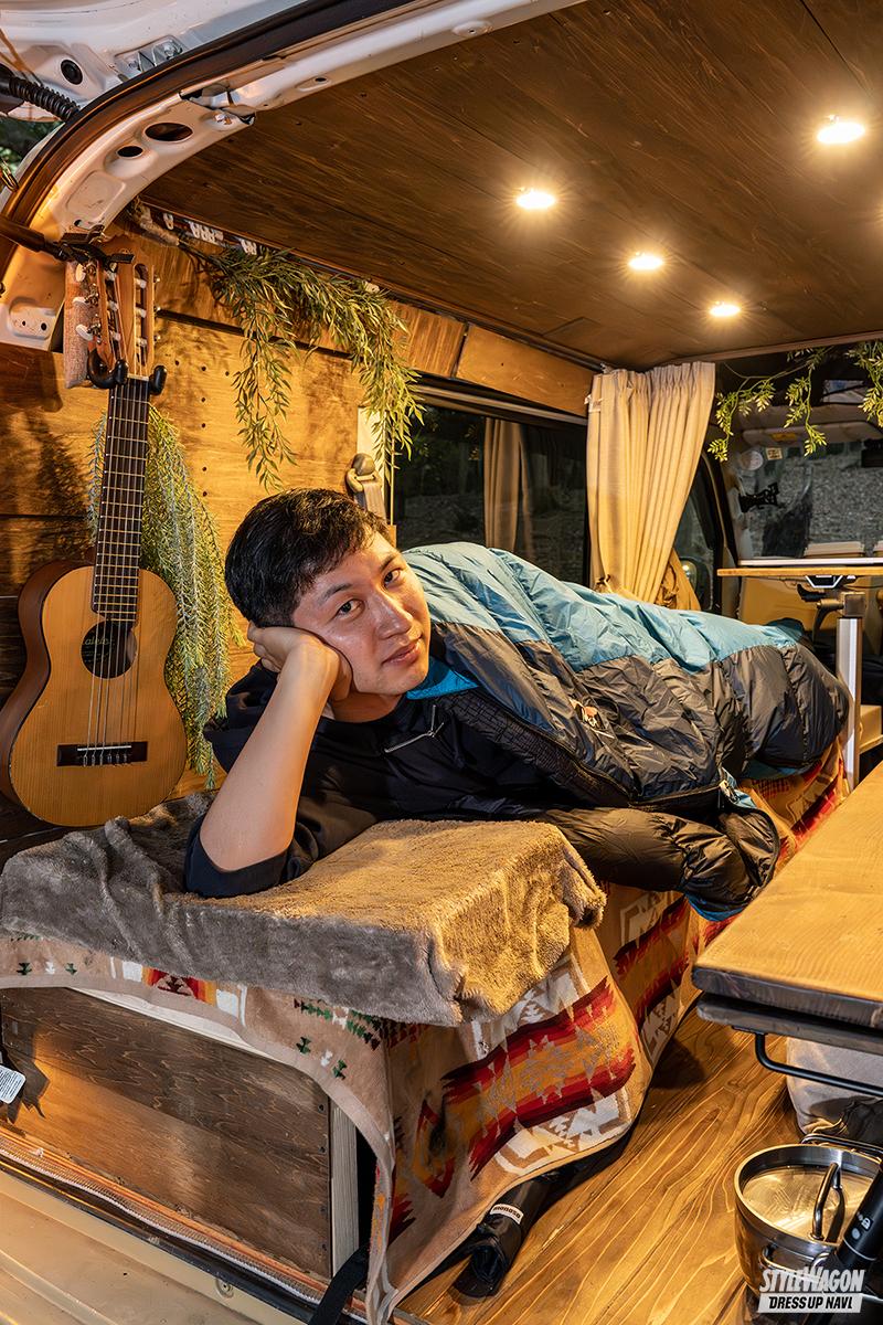 以前はテントキャンプをしていたが、「だんだん面倒臭くなってきた」「雨の日とか大変」ということで、快適に車中泊ができるクルマを求めるように。そこでスクラムを手に入れ、DIYで“自分仕様”にカスタムした。注目は車内。ウッド仕様の内装は個性的で、雰囲気も◎。三脚を活用したテーブルは使い勝手も考慮した作りであるなど、参考にしたいという読者も多いかも!?