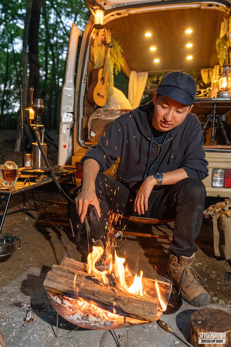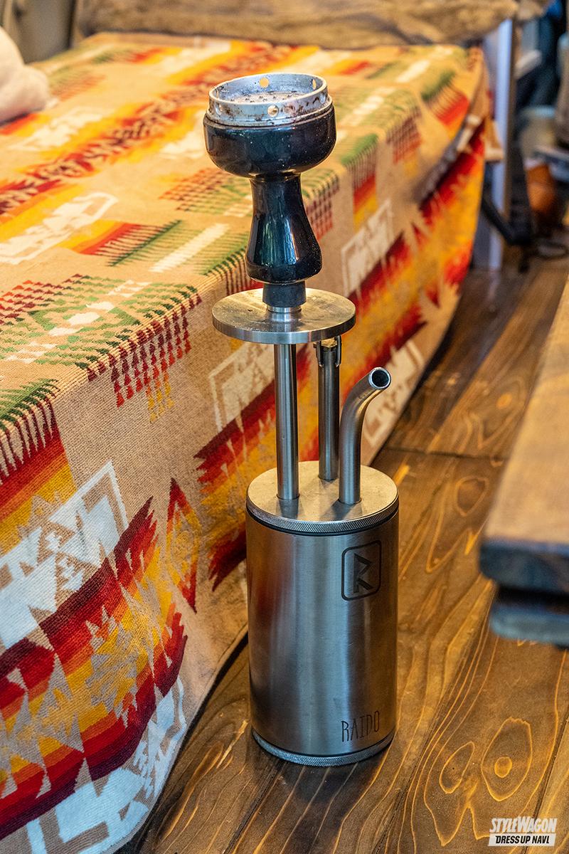 そして“快適”を排除していない点もポイント。ソーラー&サブバッテリー完備に加え、クーラーまで常備するのだから。いざというときには車内でノートPCを開いて仕事までできる。一方で“手間”も惜しまない。シーシャ(水たばこ)は、火をつければ準備完了という紙たばこと違い、炭の準備など手間がかかる。しかし様々なフレーバーを組み合わせたりと、趣味として楽しめる要素が多い。ソレをキャンプの現場でゆったり満喫するのだ。たき火の前で、シーシャを吸いながらキャンプ飯を準備する。そんな非日常感をりょうすけさんは楽しんでいる。