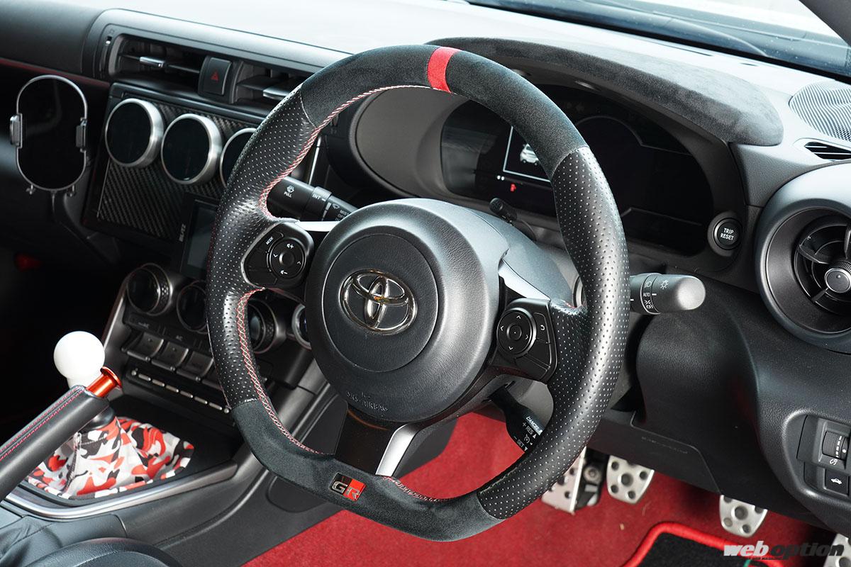 インテリアでは、レアル製ステアリングのオリジナルバージョン(6万8750円)に目を奪われる。レザーとウルトラスウェードのコンビ素材となるが、通常製品とは配置パターンが逆になっていて、純正のダッシュパネルと統一感が生まれる。真紅のセンターマークをあしらったのもポイントで、トヨタ純正のGRエンブレムも製品に付属される。
