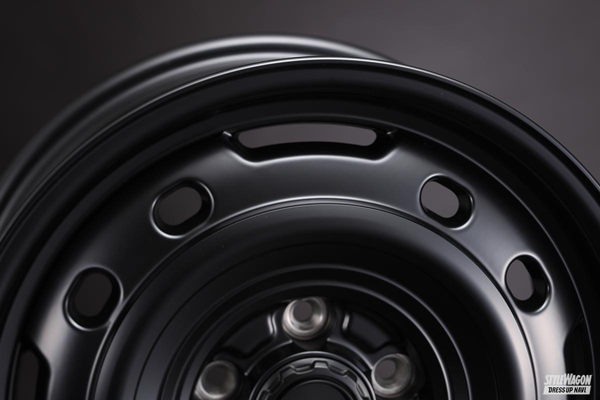 オフスタイルⅡのコンセプトはずばり、無骨でクラシカルな往年の「テッチン」風。広く取ったセンター部に円を基調とした段差を設けた設計は、まさに懐かしのスチールホイール感が満点。スクエアに近い窓を開け、ディスクエンド4ヵ所に大きな切り欠きを添えることでギア感を高めるなど、ひと味ちがう装いを加えたのも新鮮だ。