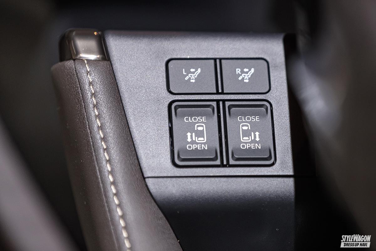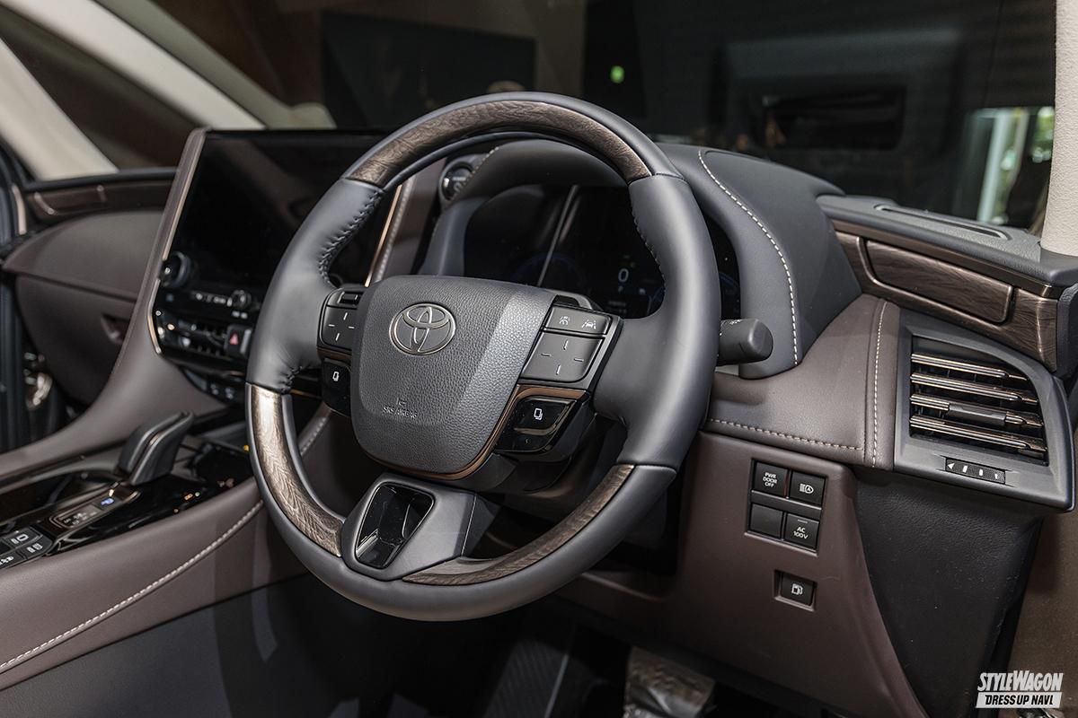 ワイドなセンターコンソールから厚みのあるインパネ、ドアトリムまで包み込むように広がる空間は、どの席に座ってもトヨタが得意とする高い質感を存分に味わえる。「エグゼクティブラウンジ」は、屋久杉のうずら杢をモチーフにしたという「UZURAMOKU」と光沢感のあるエンボス加工が施された合成皮革のトリムを用意。シート表皮は、プレミアムナッパ本革になり、見た目も触感も上質だ。