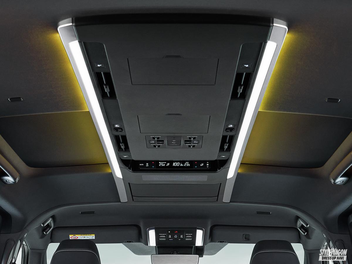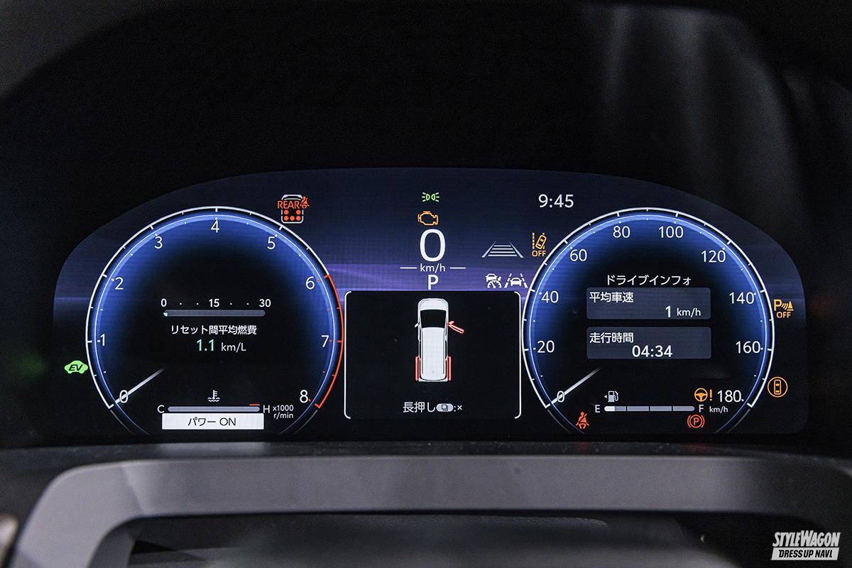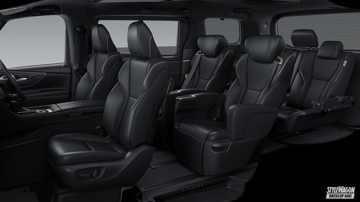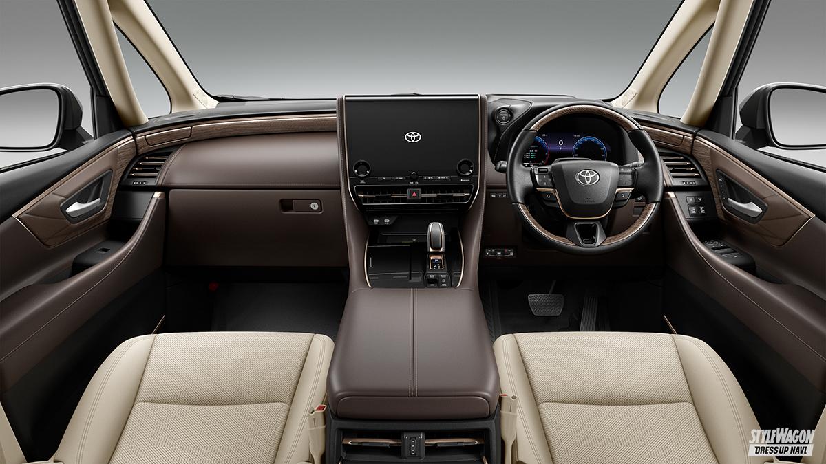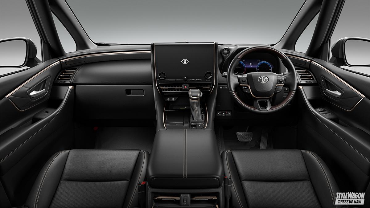 「Z」を選んでも隙のない仕立てを享受できる。マット感のある木目調加飾「DARK BROWN」とエンボス加工が施された合成皮革のトリムが、インパネから後方まで覆う。「Z」はシート地も合成皮革だが、チープさとは無縁だ。こうした高い包まれ感を抱かせながらも2列目は、新設のスーパーロングオーバーヘッドコンソールをはじめ、「エグゼクティブラウンジシート」はもちろん、「Z」の「エグゼクティブパワーシート」も大型アームレストやパワーオットマンを備え、プライベート感を抱かせるおもてなしの精神が息づいている。さらに、無駄を徹底的に廃した「体脂肪率0パッケージ」を謳い、ミリ単位で設計されたことで、1〜3列目間の距離を10㎜広げた。インパネで目に飛び込んで来るのが、コネクティッドナビ対応の14インチディスプレイで、後席からも高い視認性を確保する。「Executive Lounge」は、15スピーカーと12chオーディオアンプを備えるJBLプレミアムサウンドシステムを標準化する(Zは10スピーカー)。
