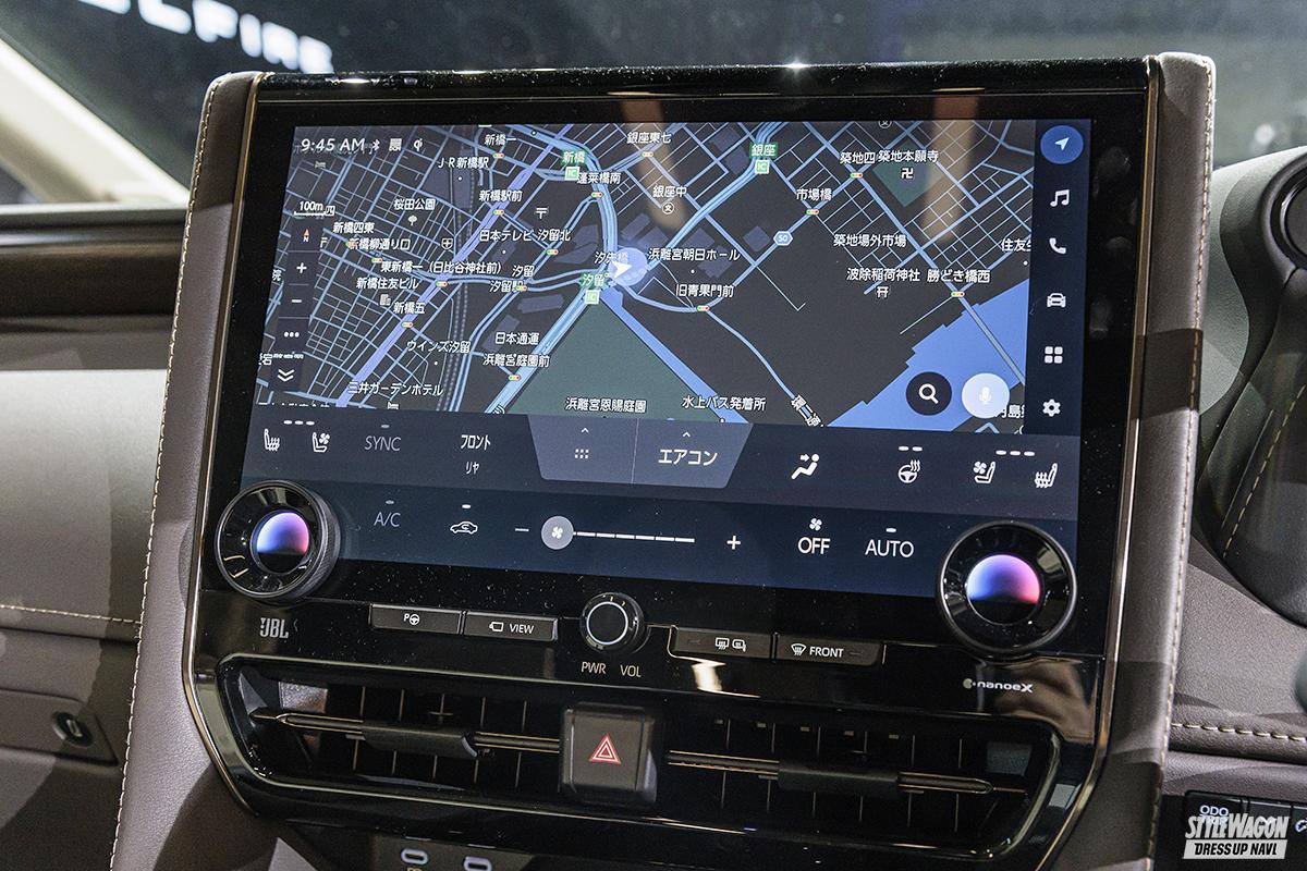 「Z」を選んでも隙のない仕立てを享受できる。マット感のある木目調加飾「DARK BROWN」とエンボス加工が施された合成皮革のトリムが、インパネから後方まで覆う。「Z」はシート地も合成皮革だが、チープさとは無縁だ。こうした高い包まれ感を抱かせながらも2列目は、新設のスーパーロングオーバーヘッドコンソールをはじめ、「エグゼクティブラウンジシート」はもちろん、「Z」の「エグゼクティブパワーシート」も大型アームレストやパワーオットマンを備え、プライベート感を抱かせるおもてなしの精神が息づいている。さらに、無駄を徹底的に廃した「体脂肪率0パッケージ」を謳い、ミリ単位で設計されたことで、1〜3列目間の距離を10㎜広げた。インパネで目に飛び込んで来るのが、コネクティッドナビ対応の14インチディスプレイで、後席からも高い視認性を確保する。「Executive Lounge」は、15スピーカーと12chオーディオアンプを備えるJBLプレミアムサウンドシステムを標準化する(Zは10スピーカー)。