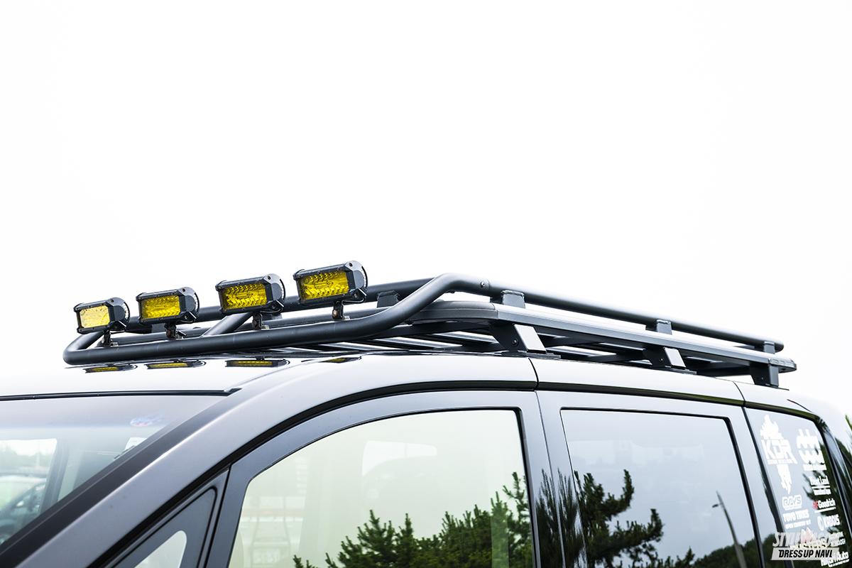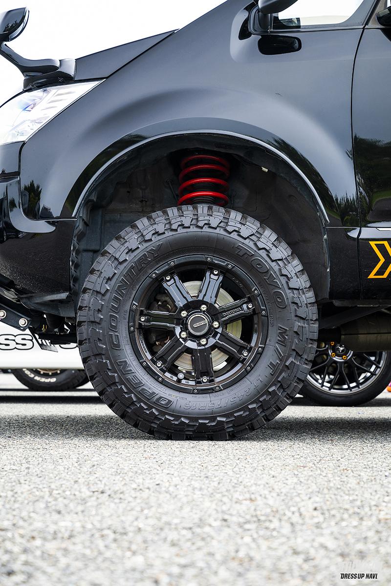 ホイール:レイズ・チームデイトナ FDX-D(16×7.0J) タイヤ:トーヨー・オープンカントリーMT(245/75) エクステリア:フロント・ルーフラック=オートフラッグス、サイド=ハートランド、リア=カディス サスペンション:アップスプリング=タナベ、リフトアップキット=ハートランド ほか