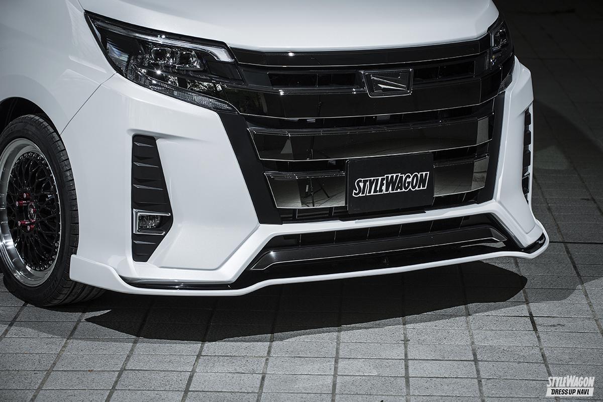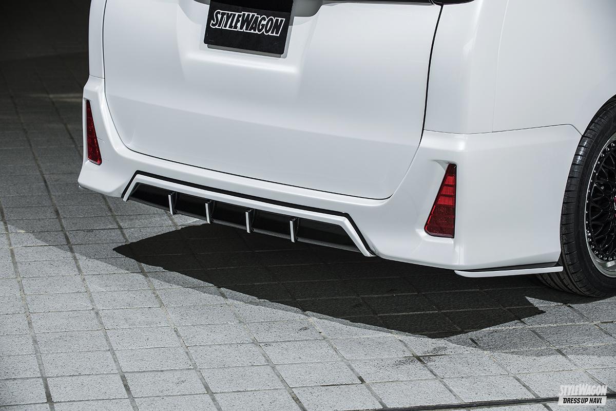 純正ボディに対し、ほんの僅か味付けするだけのミニマムエアロ。リアは2パーツ構成で、側面部とは別に中央部にガーニッシュが用意されている(ヴォクシー共通)。あまり見かけるケースの少ないボンネットスポイラーもある。