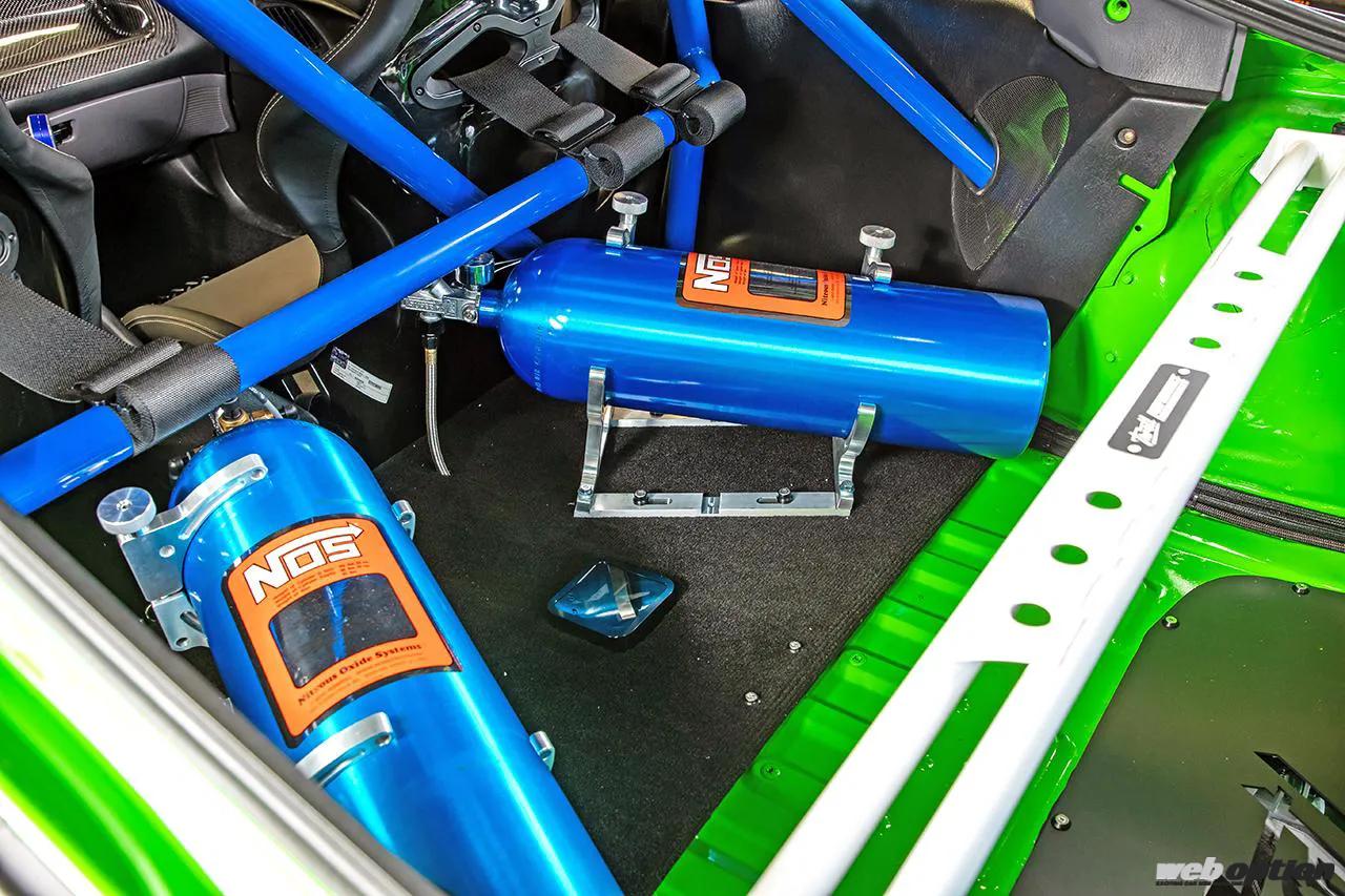 また、ワイルド・スピードではブライアンがストリートレースでNOSを使用するシーンが有名なので、アイコンとして欠かせない。ということで、Throtlのエクリプスにも室内に2つのタンクが仕込まれているのだが、実はエンジンにNOSを供給するタンクはひとつだけで、もうひとつはエアサス用のタンクとして使っている。
