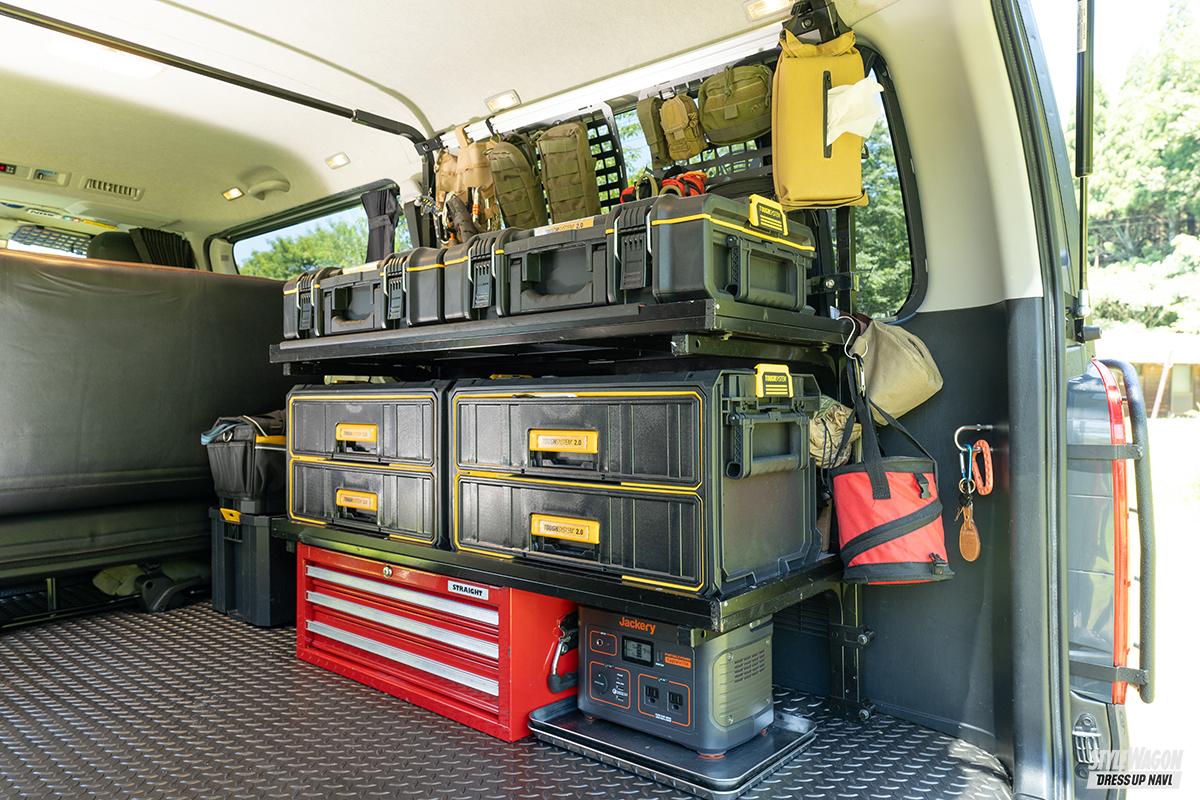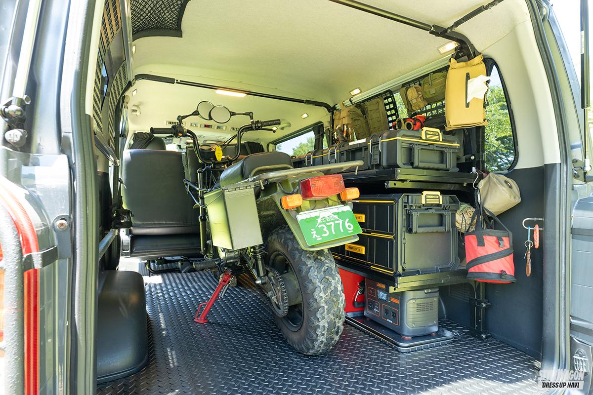 「昔からヨンクが好きで。何でも積めるしどこにでも行けるのが魅力ですね。工具などを積むためのラックは製作していますが、ベッドはあえて置かず。でもトランポにもなるし車中泊もできる。実用性重視ですね」。
