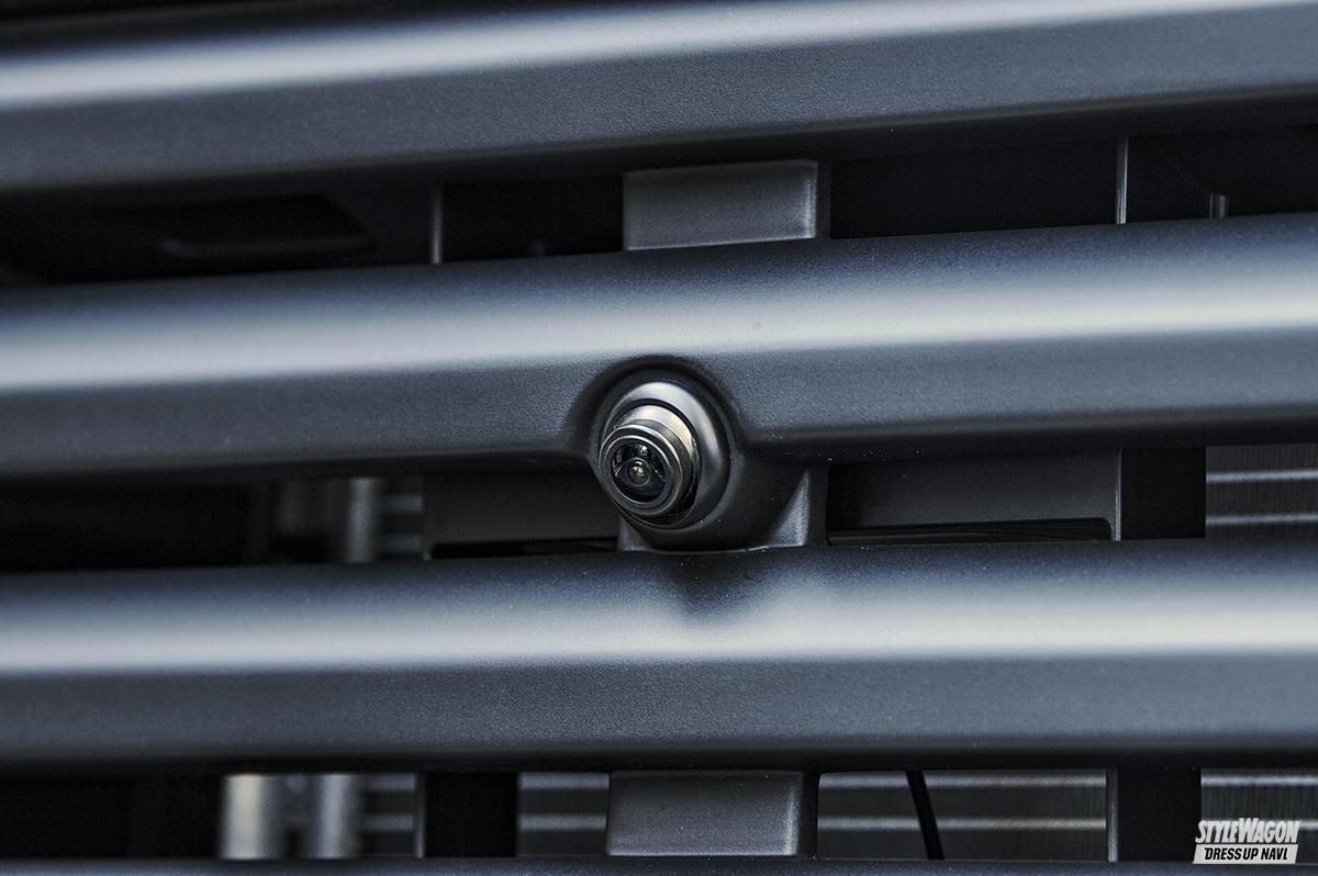 次に前方の死角をクリアしたいなら、カメラが内蔵されたオリジナルフロントグリルがオススメ。純正とは異なる横フィン基調のスッキリとしたデザインはドレスアップ効果が高く、フロントマスクのイメージを変えたいという人に最適。カメラもコンパクト設計なので違和感はない。もう少し手軽にカメラを導入したいなら、グリルのエンブレムに合わせて作られたカバーを活用したエンブレムフロントカメラキットが最適。フロントカメラの装着場所に悩むこともない。