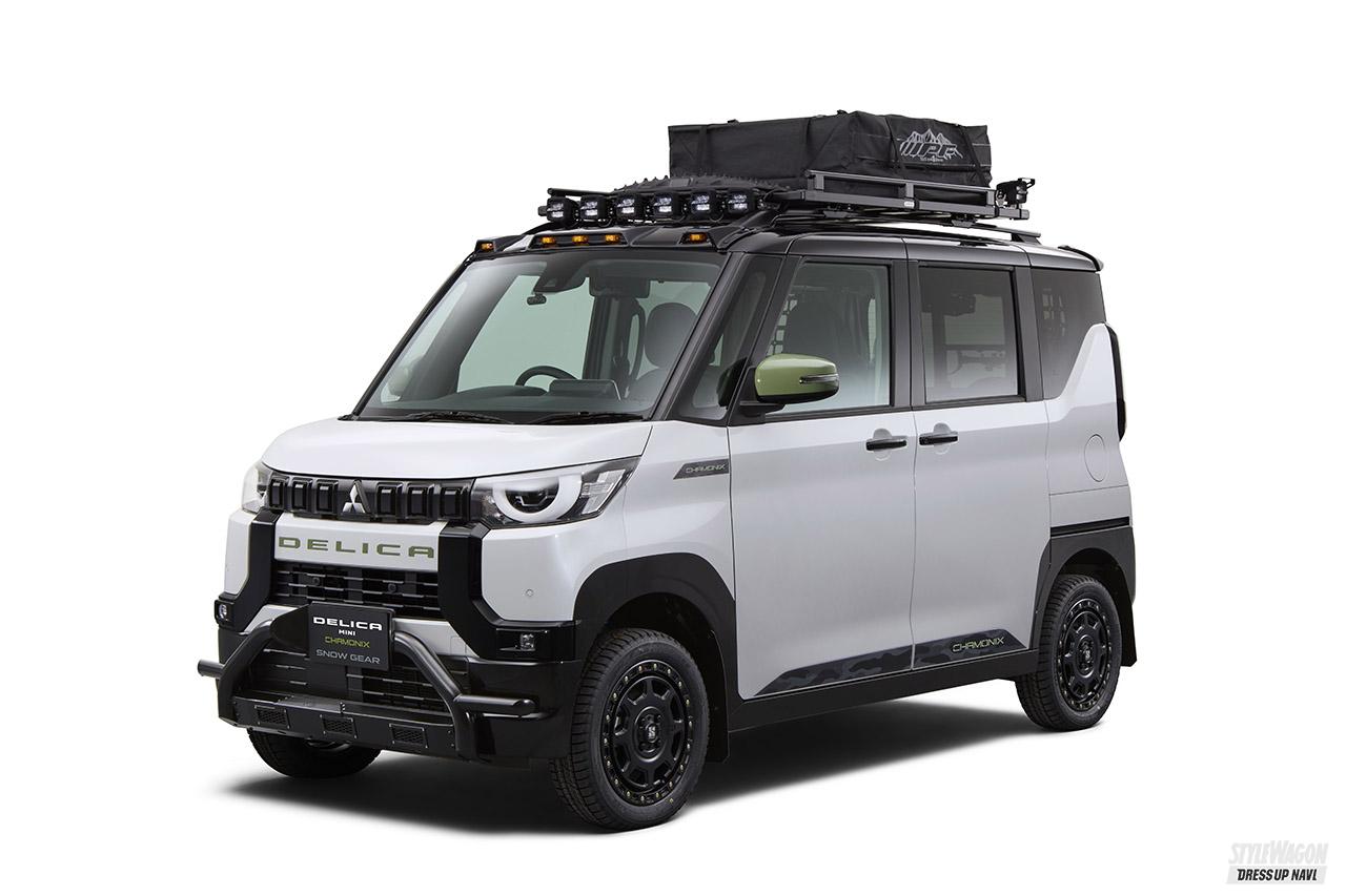 デリカD:5の特別仕様車「CHAMONIX(シャモニー)」とデリカミニのディーラーオプションパッケージ「CHAMONIXパッケージ」装着車をベースとし、家族や仲間と冬のアウトドアアクティビティを満喫するギアがコンセプト。雪道を安心して力強く駆け抜けるデリカシリーズを、共通の世界観でコーディネイトしたカスタムカー。