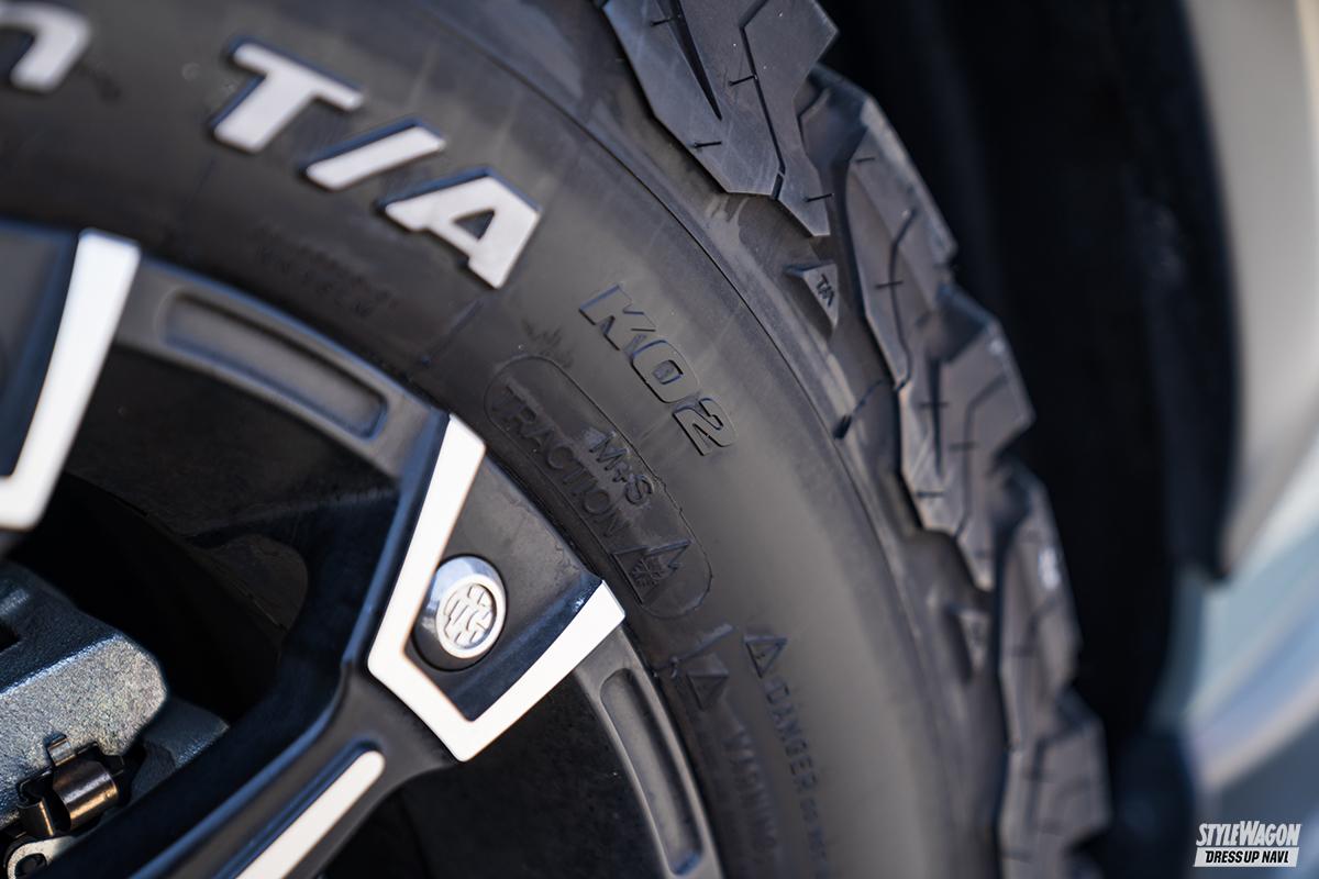ブロックパターンがゴツゴツしているオフロードタイヤには、オフロードもオンロードも快適に走れる「A/T(オールテレーン」タイヤのほか、悪路走破性に優れる「M/T(マッドテレーン)」タイヤ、そして両者のいいとこ取りをした「R/T(ラギッドテレーン)」タイヤの3種類がある。そんなオフロード系タイヤの一部に刻印されているのが「スノーフレークマーク」(タイヤメーカーによっては「3PMSF(スリーピークマウンテンフレームマーク)」と表記される)と「M+S(マッド&スノー)」マーク。実はこれ、国際基準で定められたシビアスノータイヤ要件に適合しており、高い雪上性能を誇り、冬用タイヤ規制時でもそのまま走れるという証。高速道路で冬用タイヤ規制が出ても、そのまま通行することができるのだ。ちなみに「M+S(マッド&スノー)」のMはMud(泥、ぬかるみ)、SはSnow(雪)を意味している。