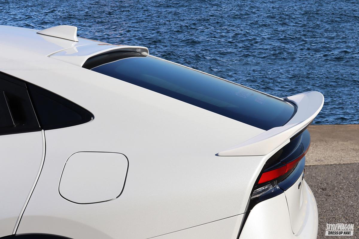 先行して登場したフロントとサイドのデザインにあわせたリアディフューザーは、リア両サイドのボトム部とセンターの3つのパートに分かれており、自分好みのスタイルをアレンジできる仕様となっているのが美点。サイドエアロ同様に、平織りカーボン仕様もラインアップしている。タイプ2のトランクスポイラーは、従来よりも張り出しを強調することでレーシーな印象をプラスする。