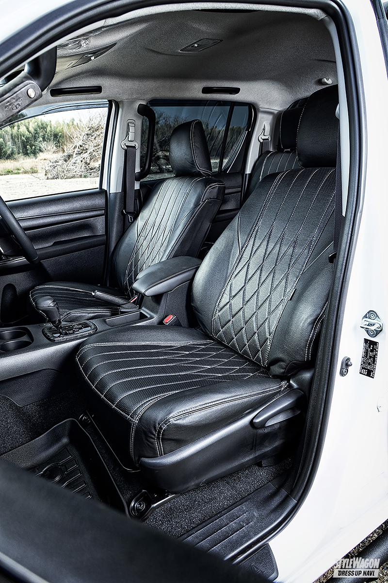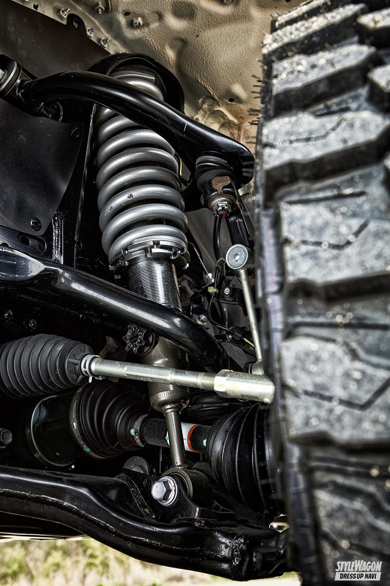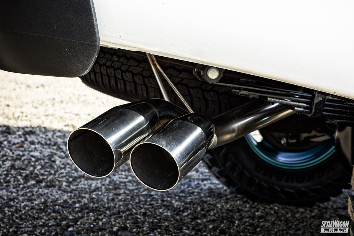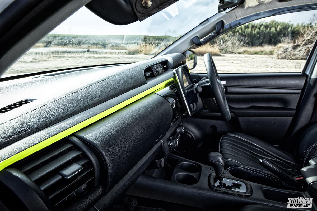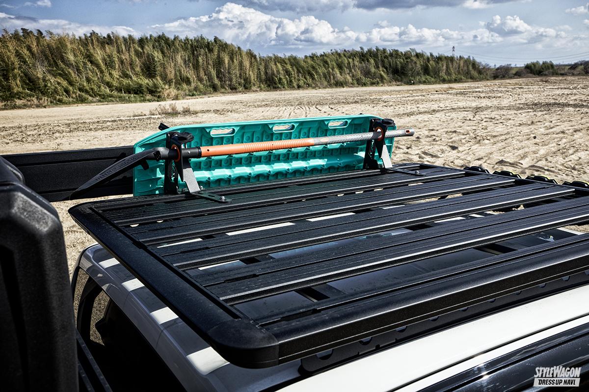 注目はギア選びと、その装着センス。パーツ一つ一つ吟味され、自信を持ってオススメできるモノばかり。とくに、4WDスタイルの源となるアクティブカーゴシステムや、プラットフォームは、トラックカスタムの本場アメリカやオーストラリアの名門メーカー製で品質、性能ともに折り紙付き。そして、ただポン付けするだけでなくひと手間かけているのがサンヤード流だ。色使いにも超こだわった。ホワイトボデイとブラックを核に、蛍光イエローグリーンをペイントやラッピングを駆使して全体に散りばめているのだ。