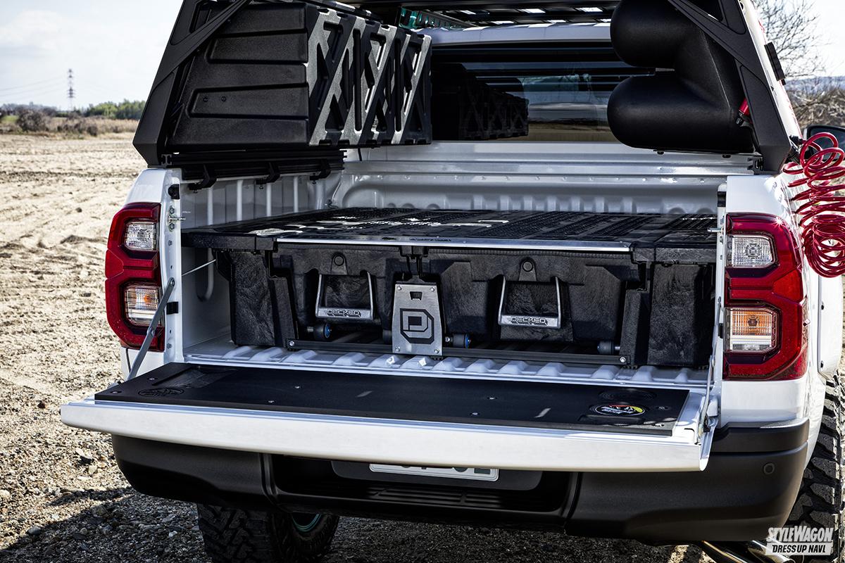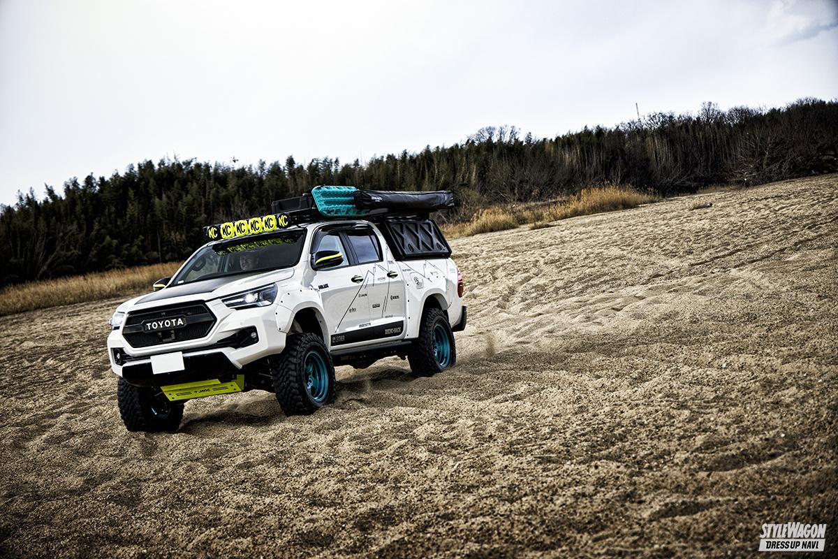 こうして発揮する瞬発的なインパクトで視線を集めると、今度はディテールでも魅せる。デカールやロゴのカラーをさり気なく変えたり、テールゲートテーブルなど目からウロコのギアを搭載していたりとワクワクが止まらない。サンヤードのコンプリートカーが支持されるのがよく分かる。ぜひスミからスミまでチェックして欲しい。