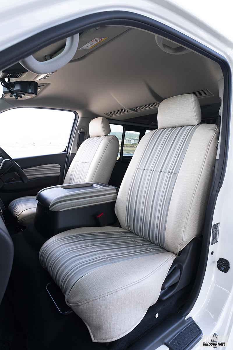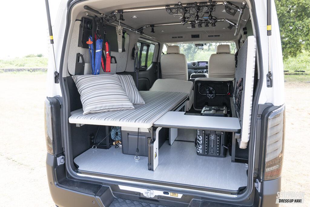 まず内装の作り込みを紹介すると、夜中に目的地である釣り場に到着した時の仮眠に便利なフリップベッド。ハネ上げ構造を採用しているのがポイントで、片側を持ち上げればベンチになり、座りながら釣りの準備ができる。レトロテイストな柄を持つベッドの生地は撥水性が高く、お手入れ簡単。シートカバーも同生地を採用して、統一感もバッチリ。格納式テーブルや収納ラックを設けたウインドウパネルも機能的なアイテムで、楽しいひとときを過ごせることは間違いない。