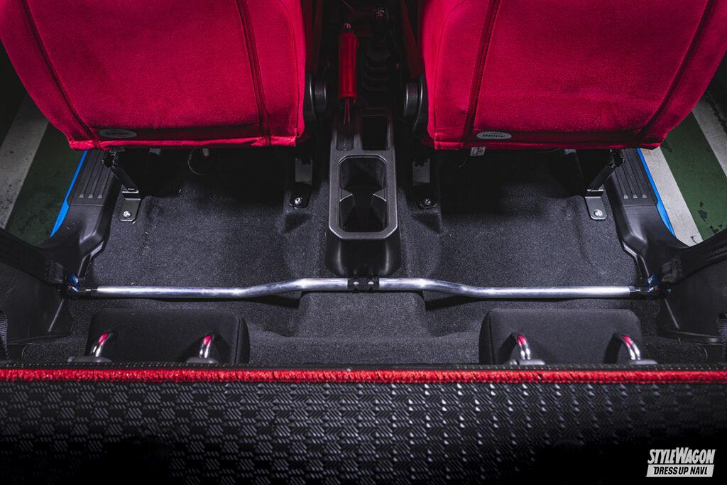 まずボディのゆがみやきしみを抑制して、クルマ全体の剛性を高めるパーツを勧めたい。ハンドリング性能を向上させるフロントのスタンダードタワーバー、シートベルト穴を活用して取り付けることでリアまわりの剛性アップを狙ったリアピラーバー、室内のフロアに取り付けるフロアサポートバーとあらゆる部分からアプローチ。コーナリング時や段差を越えた時の不安定さが気になる人はぜひ導入したい。また大口径のシングル出しマフラー、レベルサウンド304も注目。スポーティなビジュアルでありながらJQR認証を取得した車検対応品。心地良いジェントルサウンドは運転時のテンションを高めるだろう。