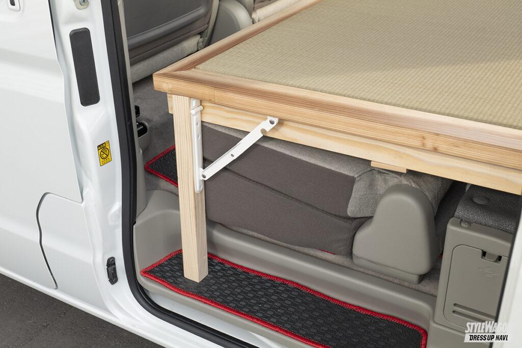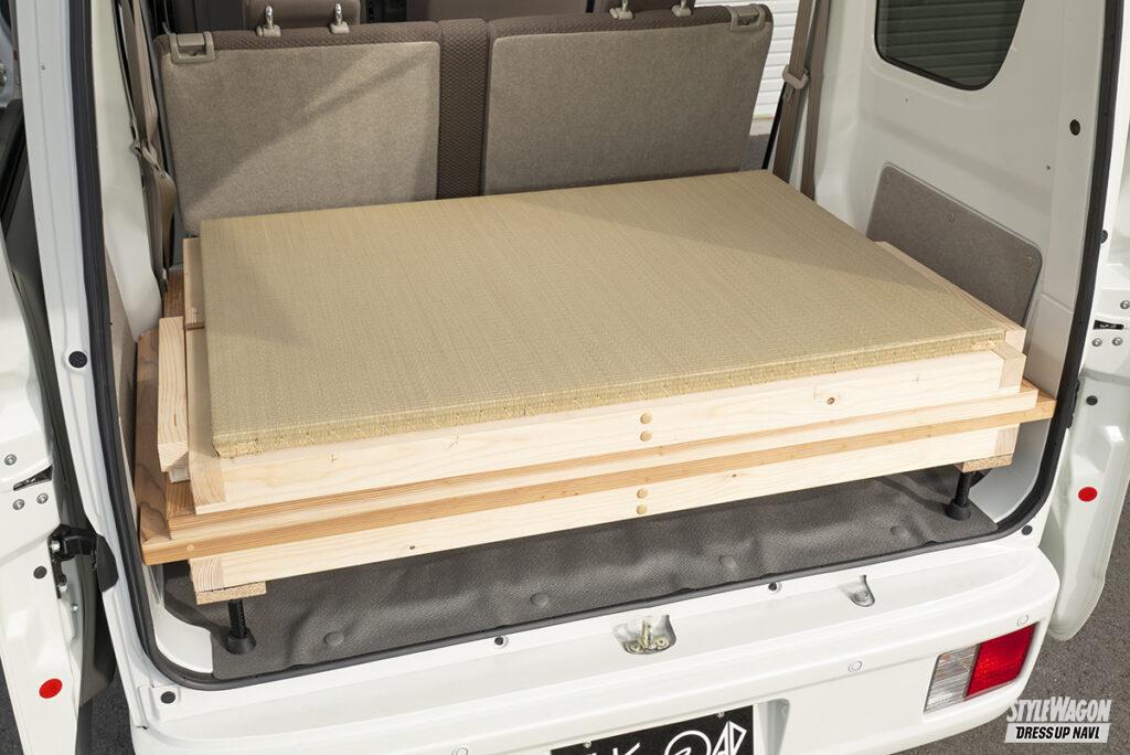 シルクロード工場長の親戚となる畳店には、飛び込みで「自分のクルマに畳を敷いてほしい」という、釣りユーザーからの依頼がここ数年で急増。その理由のひとつが、DIYにて木製パネルを使いベッド化したものの寝るには硬く、マットを置いたら食事などのモノが置きにくい。畳であれば布団や寝袋を用意しなくてもスグに横になって仮眠が取りやすいというもの。そこで中長期のキャンプではなく、ちょっとしたレジャーや1泊2日の車中泊程度なら畳の方が利便性が高いとのことがキッカケで、畳ベッドキットが商品化されたとか。畳はそのまま寝ても気持ちよく、ドリンクや食事を安定して置ける。さらに、夏は涼しく、冬は床下からの冷気を遮断する効果もあるという、メリットだらけのタタミベッドキット。注目度200%アイテム間違いナシだ。