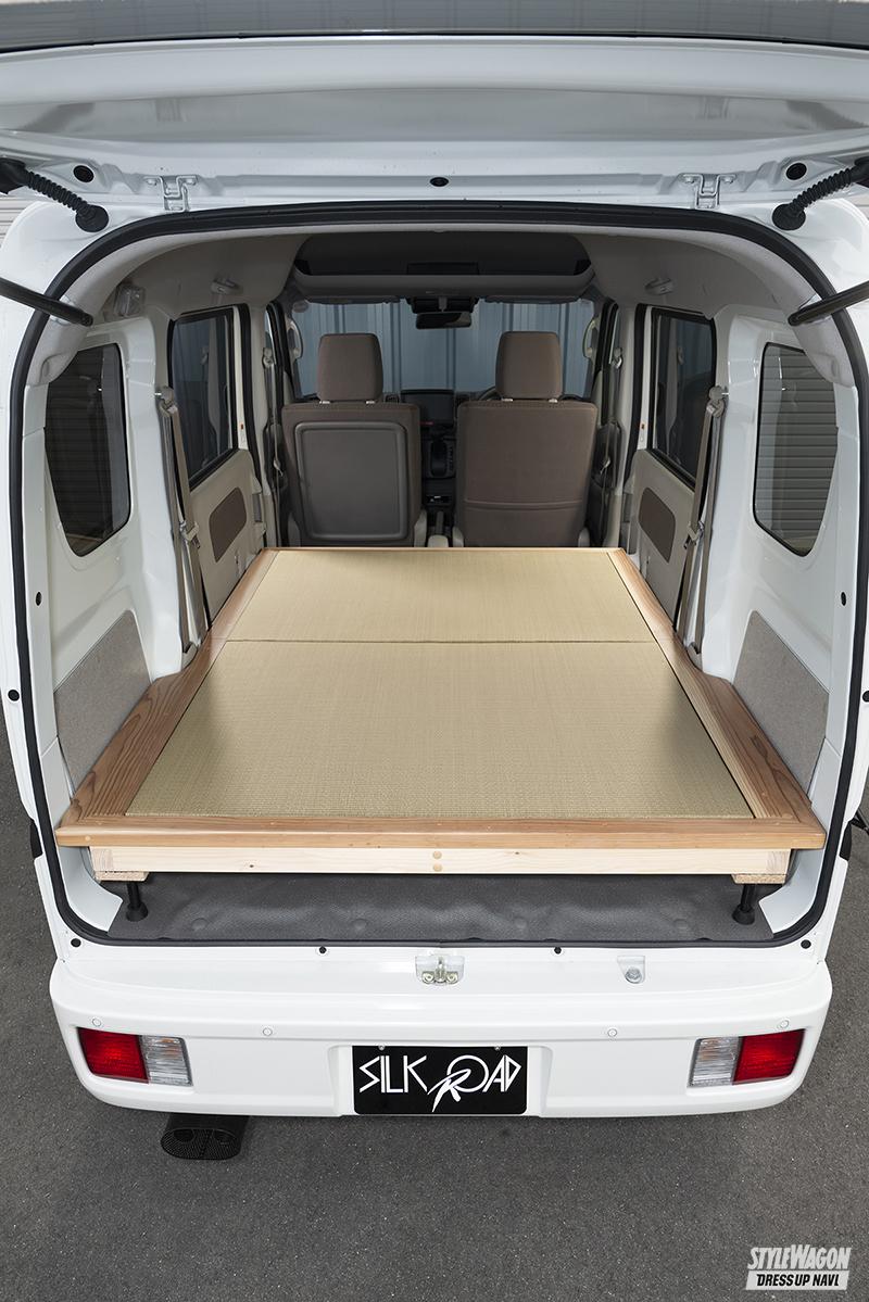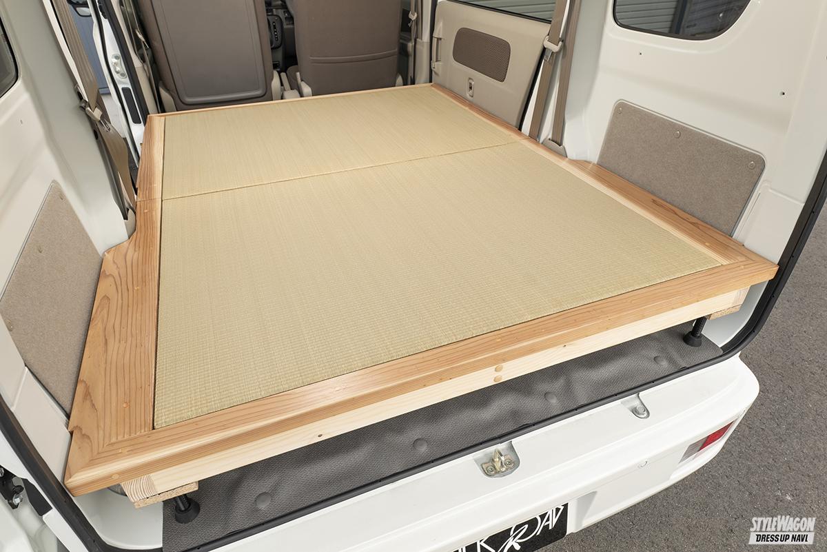 シルクロード工場長の親戚となる畳店には、飛び込みで「自分のクルマに畳を敷いてほしい」という、釣りユーザーからの依頼がここ数年で急増。その理由のひとつが、DIYにて木製パネルを使いベッド化したものの寝るには硬く、マットを置いたら食事などのモノが置きにくい。畳であれば布団や寝袋を用意しなくてもスグに横になって仮眠が取りやすいというもの。そこで中長期のキャンプではなく、ちょっとしたレジャーや1泊2日の車中泊程度なら畳の方が利便性が高いとのことがキッカケで、畳ベッドキットが商品化されたとか。畳はそのまま寝ても気持ちよく、ドリンクや食事を安定して置ける。さらに、夏は涼しく、冬は床下からの冷気を遮断する効果もあるという、メリットだらけのタタミベッドキット。注目度200%アイテム間違いナシだ。
