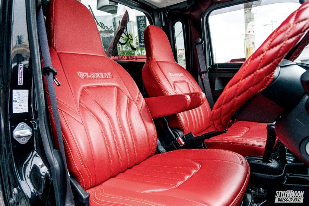 軽トラはあくまでも商用車だから質感が質素なのは仕方ないが、ケイブレイクの内装アイテムを活用すれば高級な空間に仕上がる。特に目立つのが4種類の組み合わせから選べるヴィーナスラインHGイタリーシートカバー。