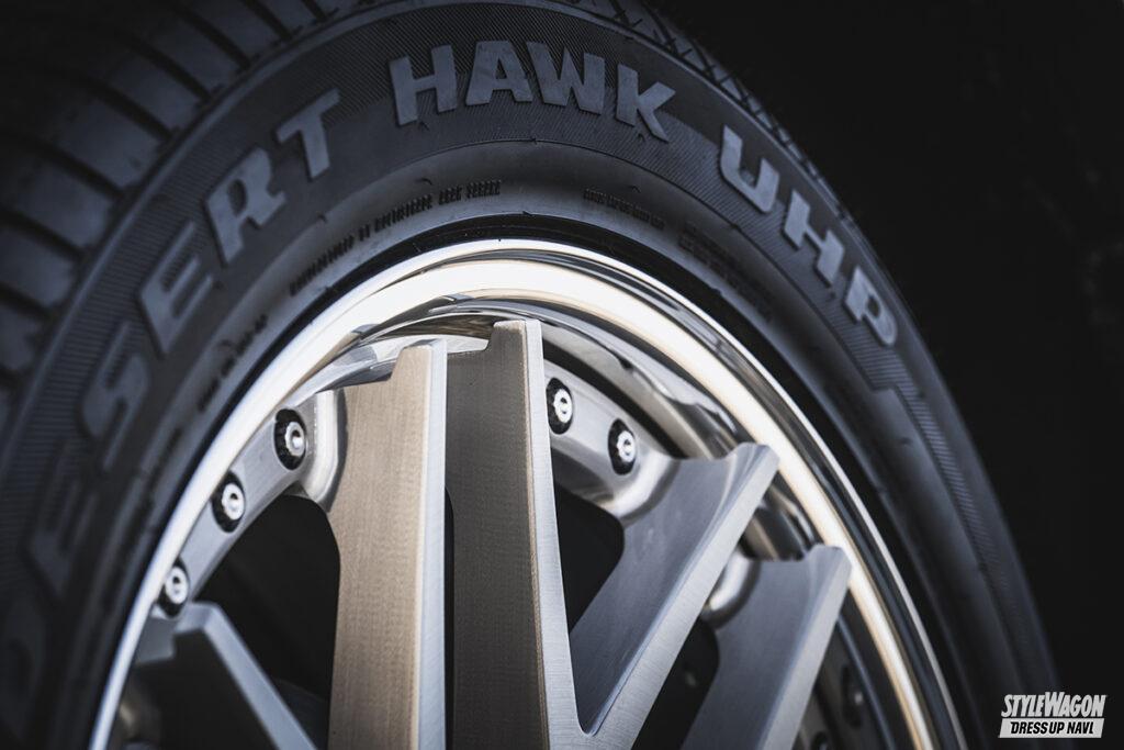一方、昔からランドクルーザーに寄り添ってきたピュアスピリッツ。このオークスXCは、4×4のラギットなスタイルとの親和性を重視した極太5スポークモデル。こちらは20×9・0J+60が専用サイズ。新色デザートゴールドは、このボディカラーと絶妙にマッチ。統一感高まるフォルムが狙える。