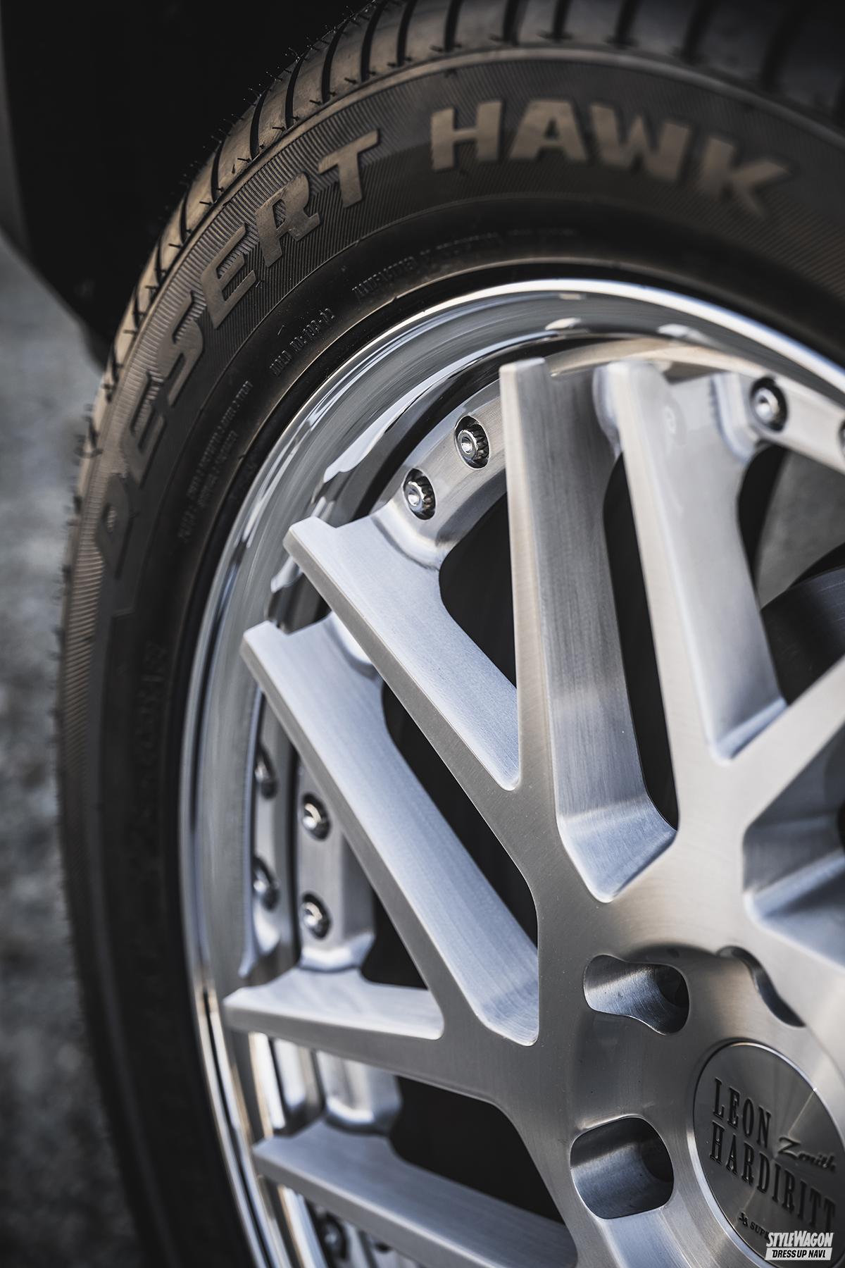 中核ブランドとなるレオンハルトからは、ジーニスガイスト。超大口径となる22/24インチを備え、デモカーの履く22×9・5J+62こそ専用サイズ。疾走感のあるアシメントリーなクロスメッシュと、31㎜のリム深度のコラボによるパンチの効いたLUXなスタイルこそ生命線だ。