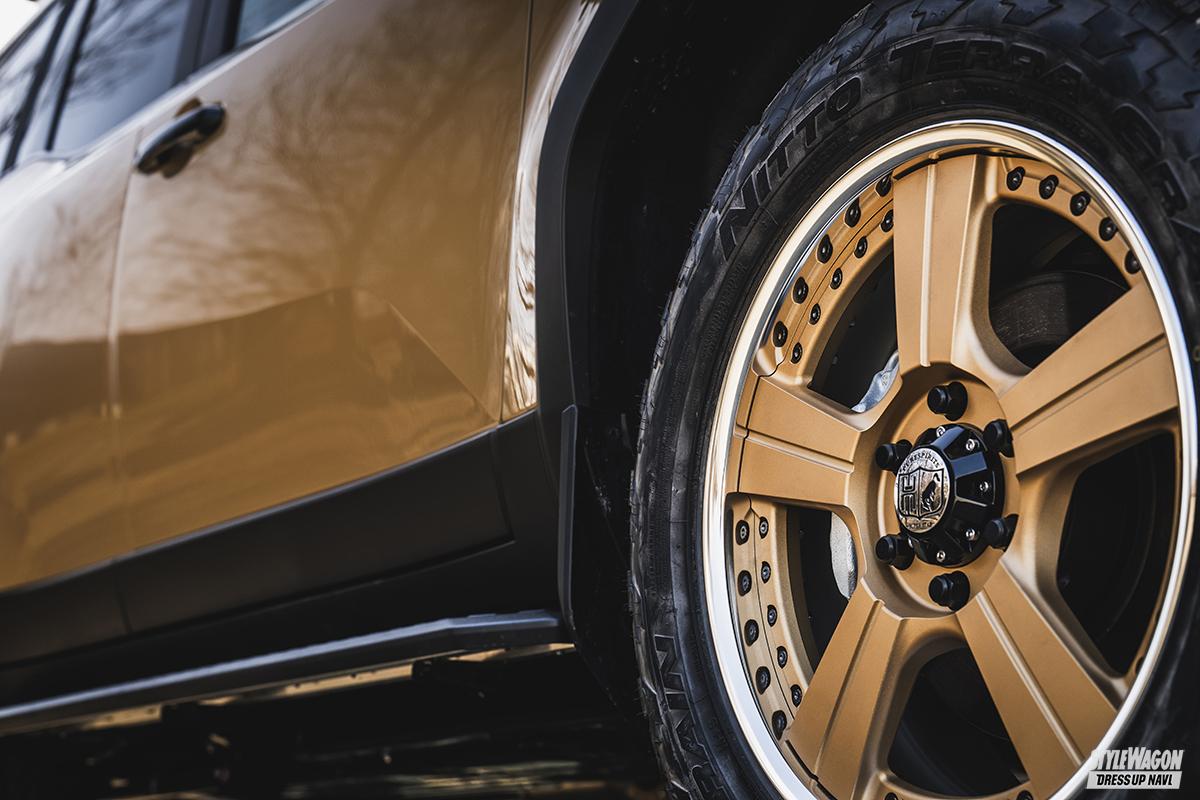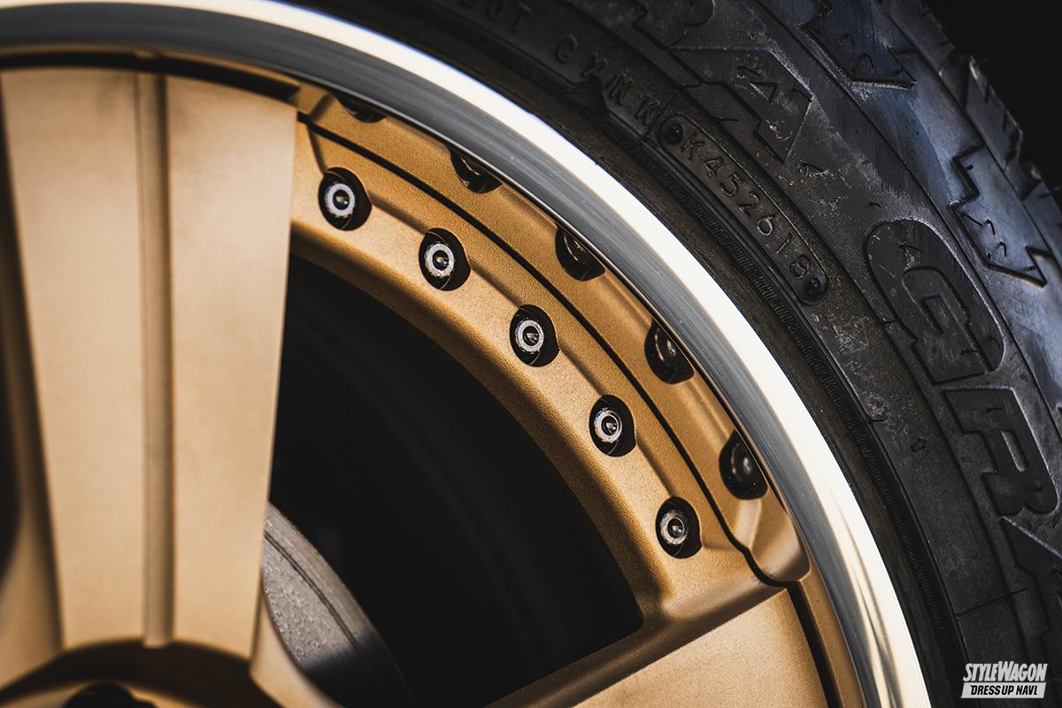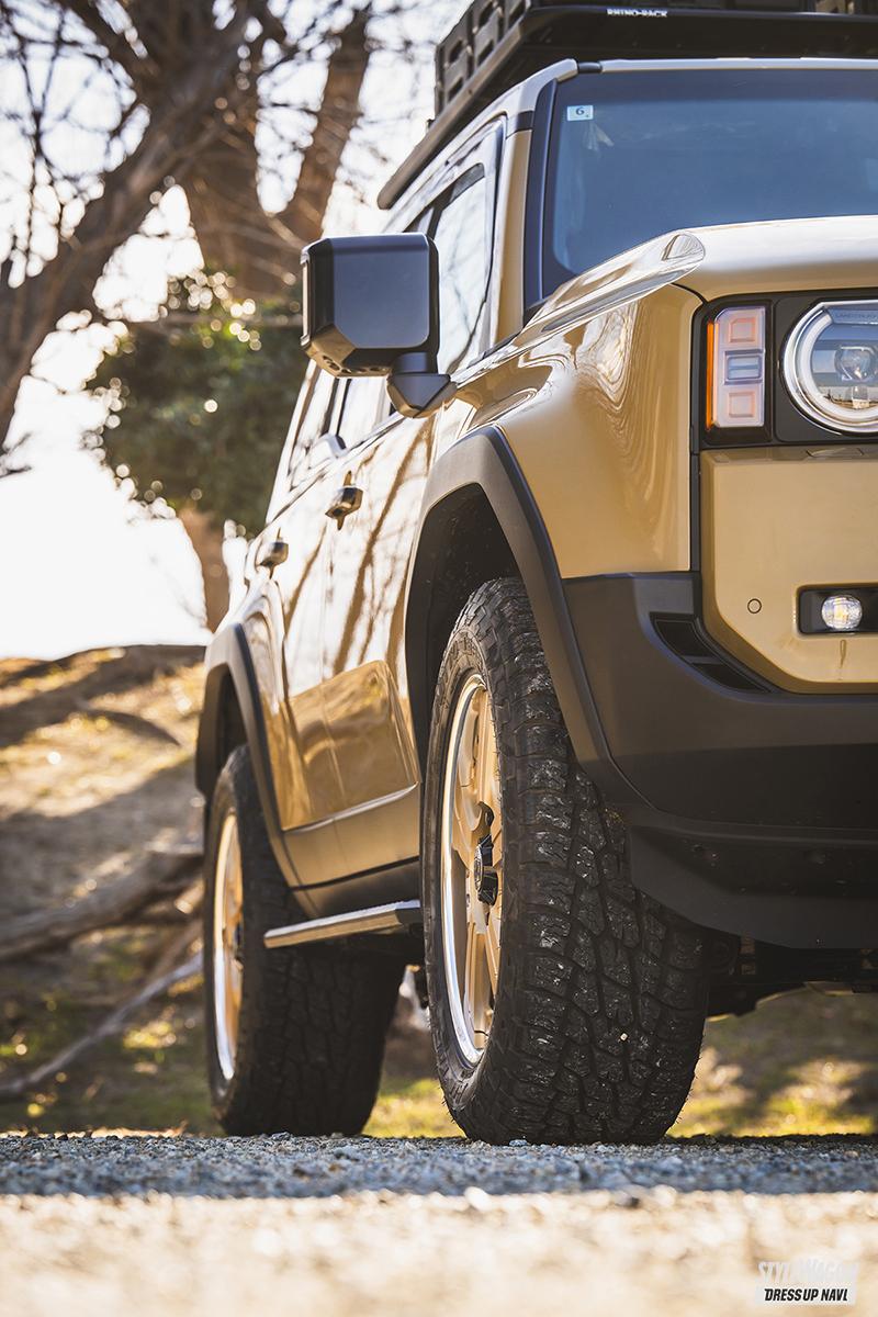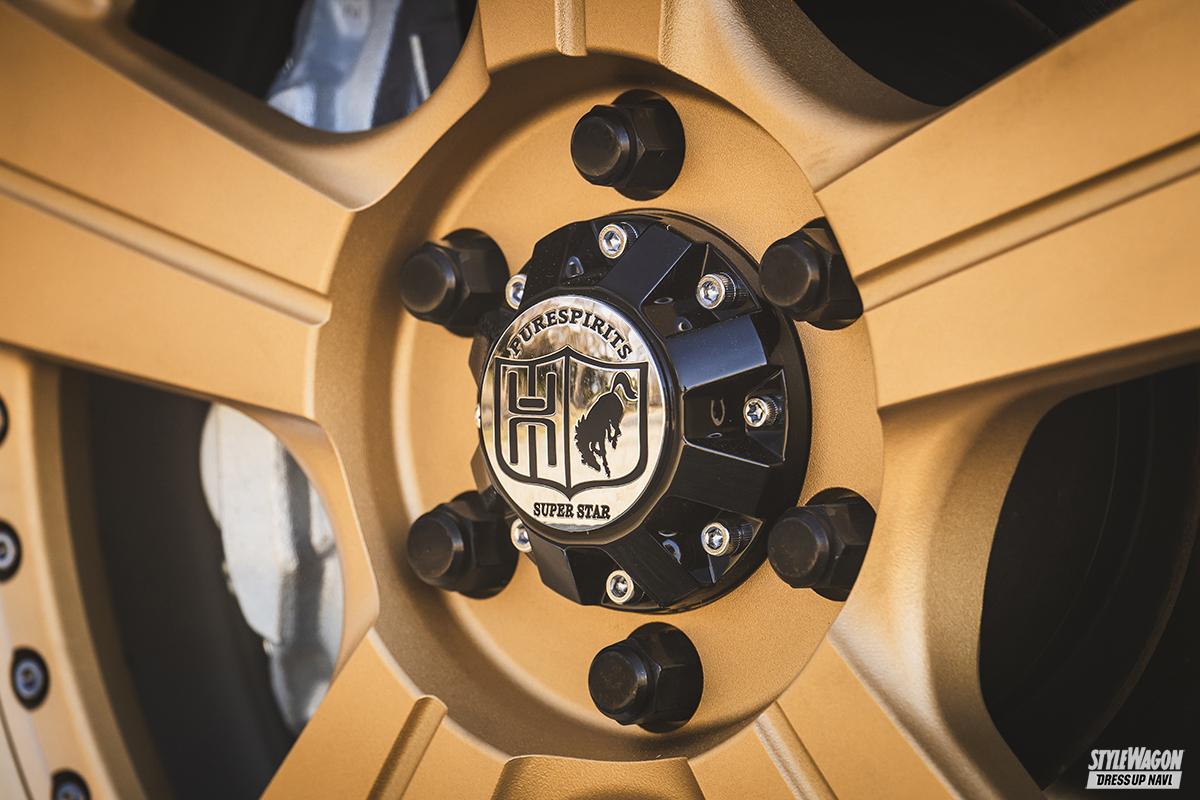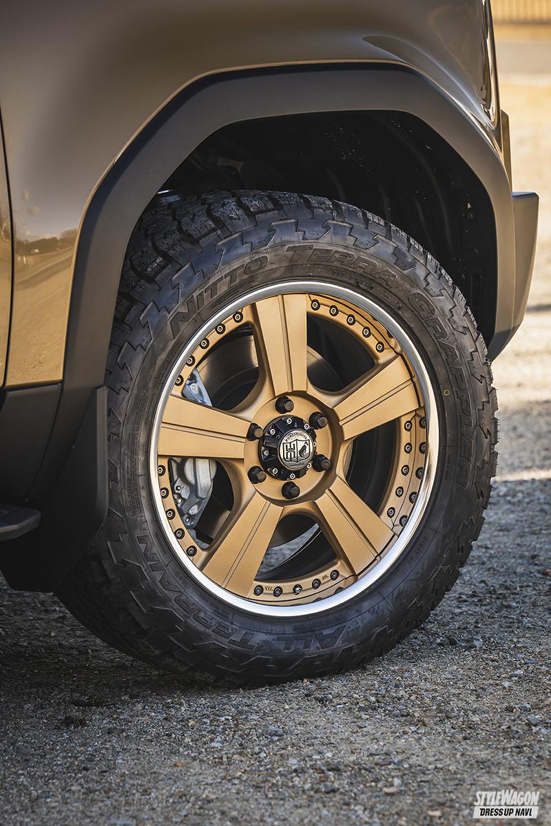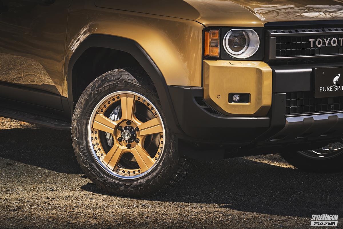 一方、昔からランドクルーザーに寄り添ってきたピュアスピリッツ。このオークスXCは、4×4のラギットなスタイルとの親和性を重視した極太5スポークモデル。こちらは20×9・0J+60が専用サイズ。新色デザートゴールドは、このボディカラーと絶妙にマッチ。統一感高まるフォルムが狙える。