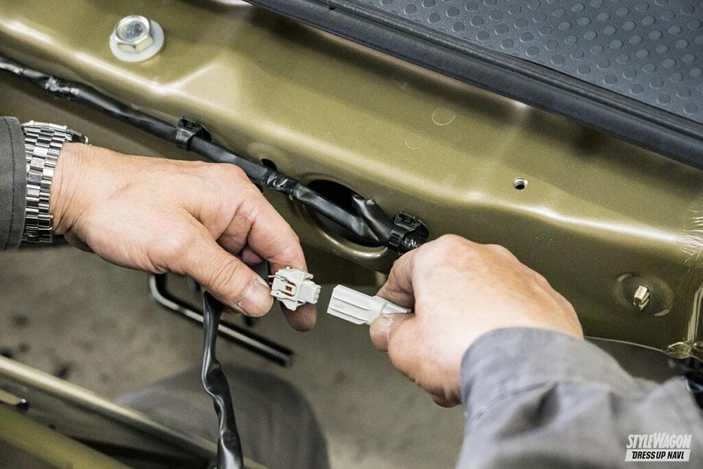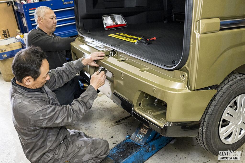 考え方はサイドステップと同じで、パネルの凹凸部分にオリジナルステーを咥えさせることでバンパーを固定させている。車体の架装を請け負っているからのアイデアだなと感心した。取り付けのポイントは組み上がったときにガタが出ないようにいかにステーを骨格に密着させるか。一度本締め同様に仮合わせし、ステー固定用の下穴をどこに空けるかがキモ。やり直しは効かないので、そこが上手くいけば、完成したようなものだ。