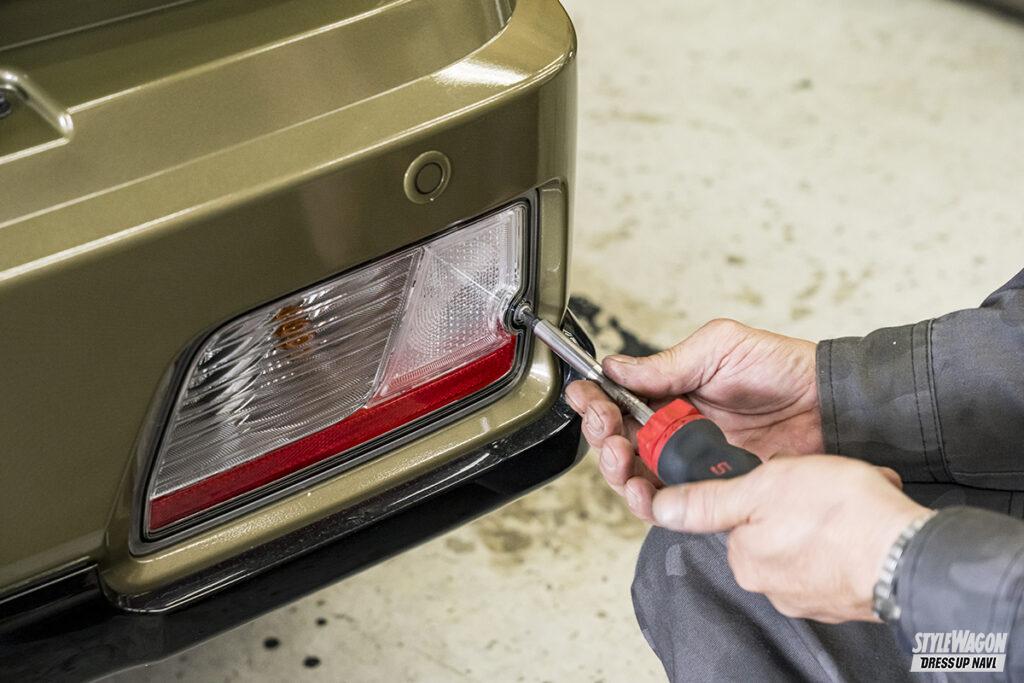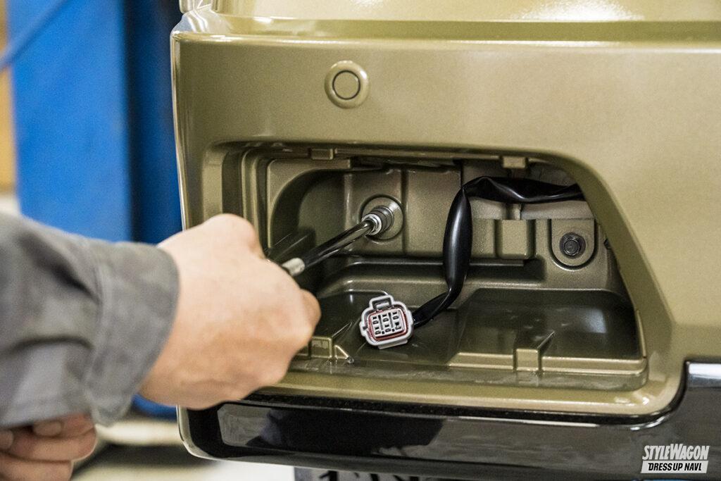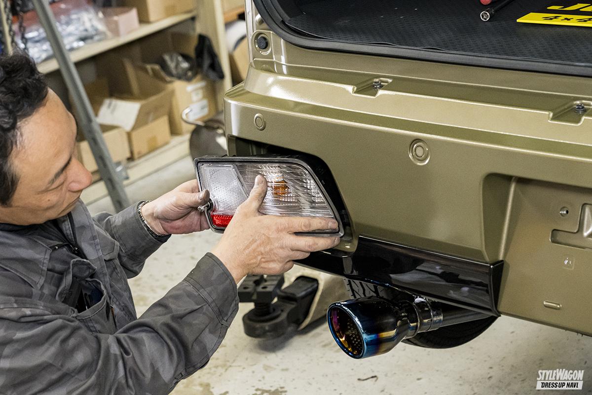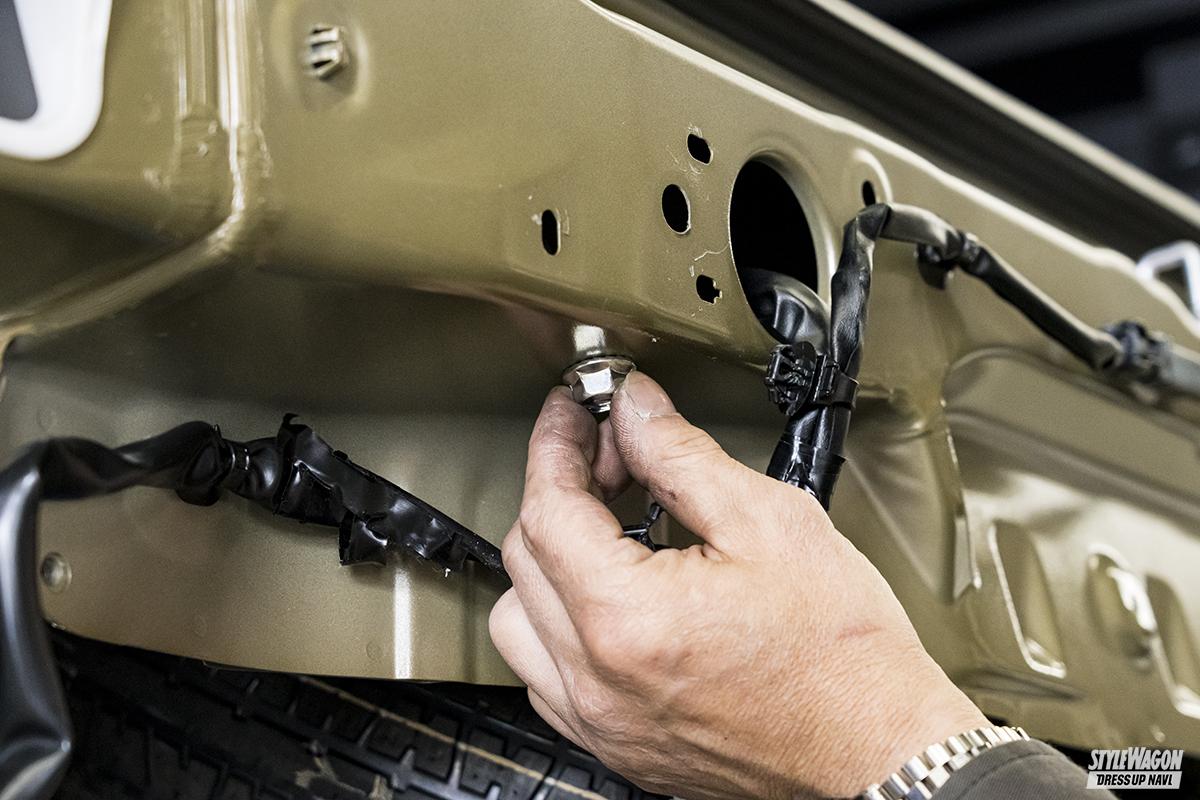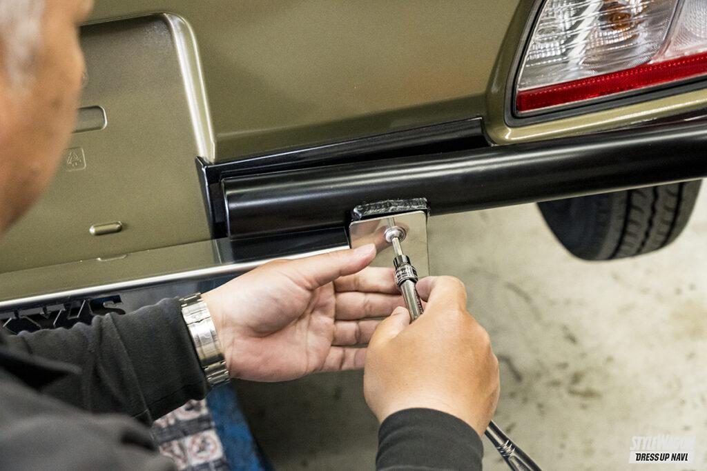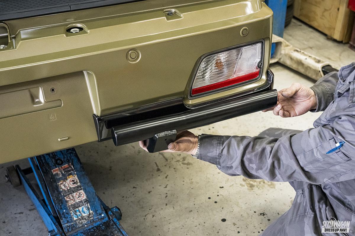 考え方はサイドステップと同じで、パネルの凹凸部分にオリジナルステーを咥えさせることでバンパーを固定させている。車体の架装を請け負っているからのアイデアだなと感心した。取り付けのポイントは組み上がったときにガタが出ないようにいかにステーを骨格に密着させるか。一度本締め同様に仮合わせし、ステー固定用の下穴をどこに空けるかがキモ。やり直しは効かないので、そこが上手くいけば、完成したようなものだ。