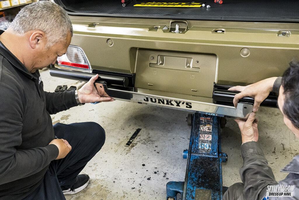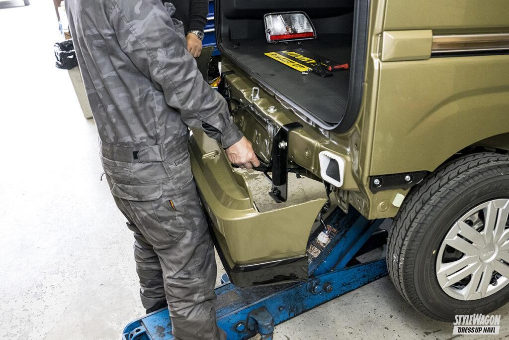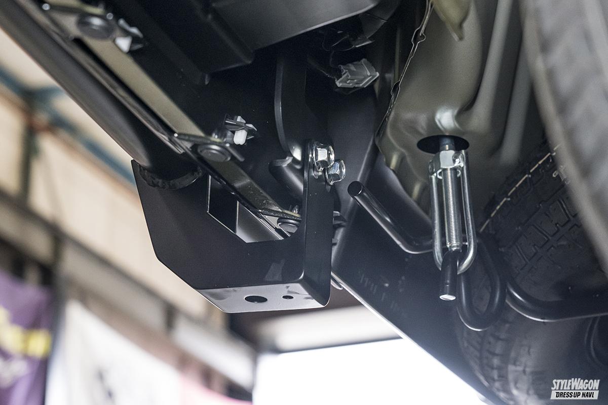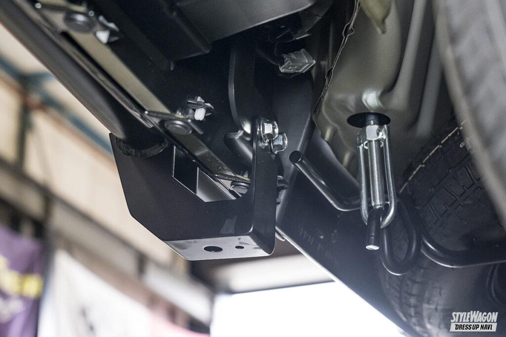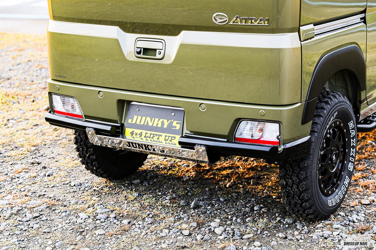 個人的な調べで申し訳ないが、アトレー用のスチールパイプバンパーはフロント用こそ複数あれど、リア用はジャンキーズ4×4製以外に見たことがない。仮に存在していたとしても、レアなアイテムであることは間違いない。ジムニーならフレームに固定すればいいが、モノコックのアトレーはどのようにマウントしているのか気になった。