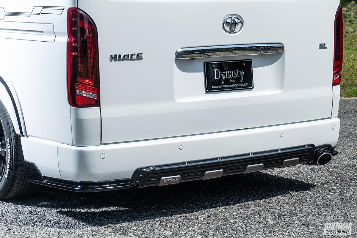 リアは純正バンパーのセンター下部に装着するディフューザー調ガーニッシュで、4つの立体ブロック形状が特徴。サイドはオーバーフェンダーのみの設定で、塗り分け可能な立体ラインを備えたフェンダーは、片側25㎜幅、下に20㎜アーチダウンする形状。