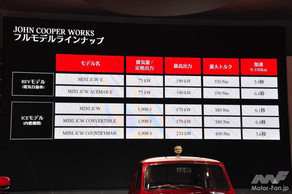 最大出力170kW・最大トルク380Nmを発揮し、0-100km/h加速はJCW Eで5.9秒、JCWエースマンEで6.4秒となっている。