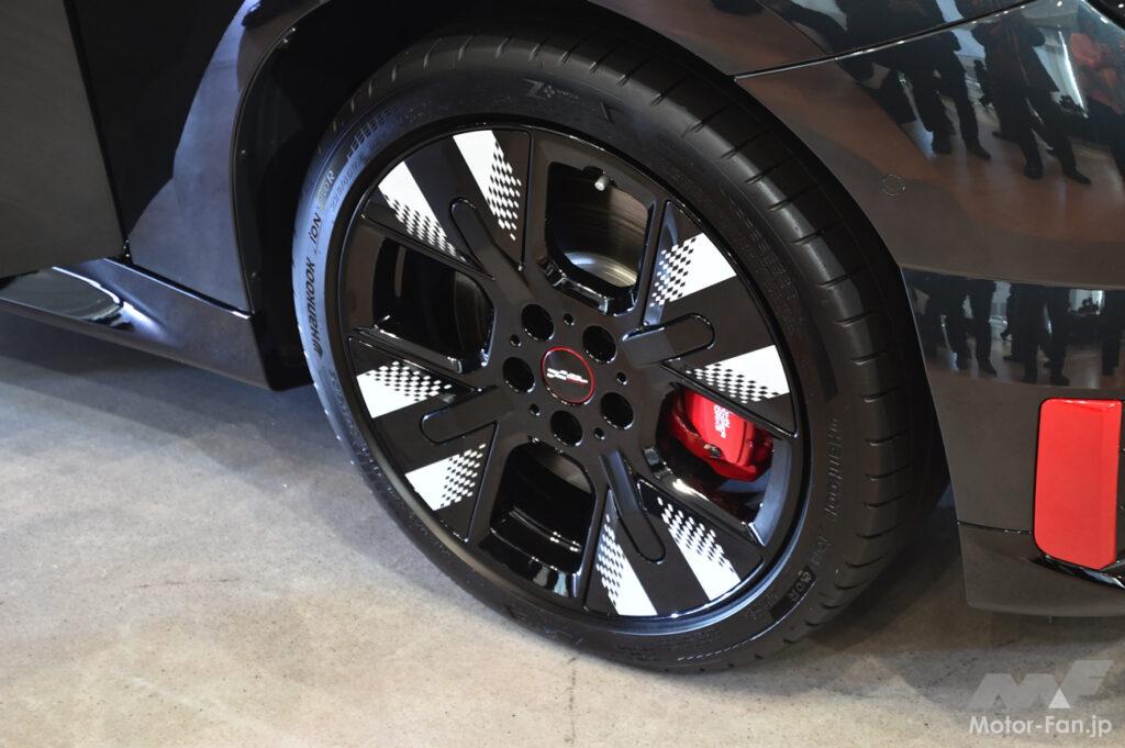 JCW E専用デザインのアルミホイールもチェッカーフラッグデザインがあしらわれ、デザインで8本スポーク風に見せている。ブレーキキャリパーもレッドに塗装され、足まわりのアクセントに。