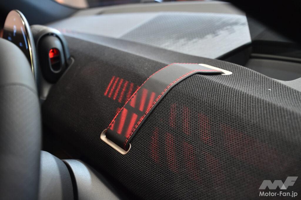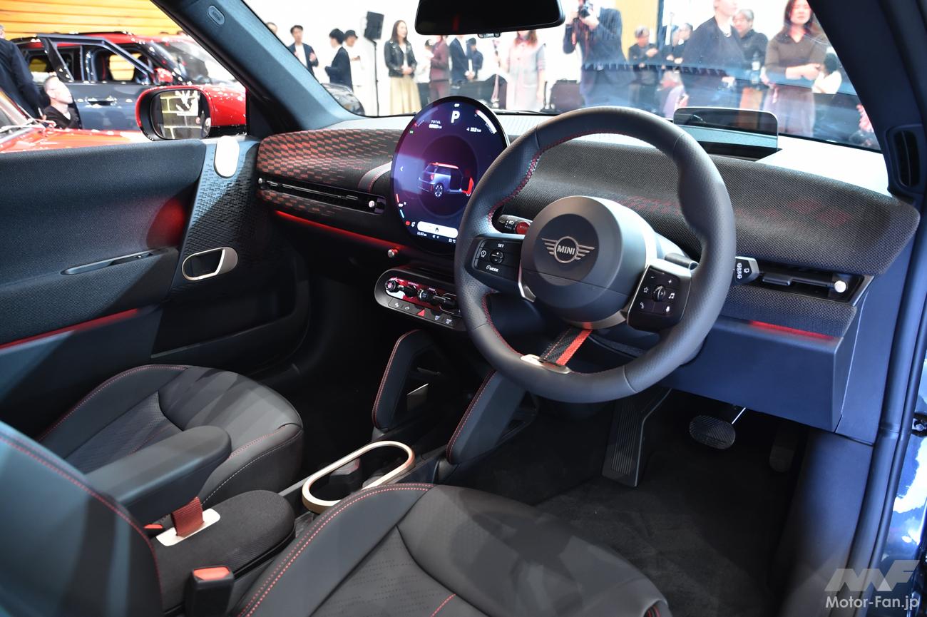 また、ガソリンエンジン車と同様の意匠ではあるが、新デザインのJCWロゴとチェッカーフラッグデザインを各所にあしらいハイパフォーマンスモデルであることをアピールしている。