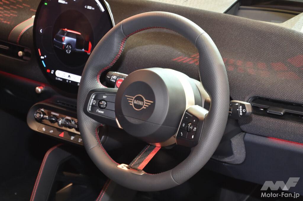 インテリアはエースマンシリーズのデザインを、JCWのテイストで演出。ダッシュボードのレッドチェッカーや6時ベルトスポークのステアリングなどはJCW Eと共通のあしらい。
