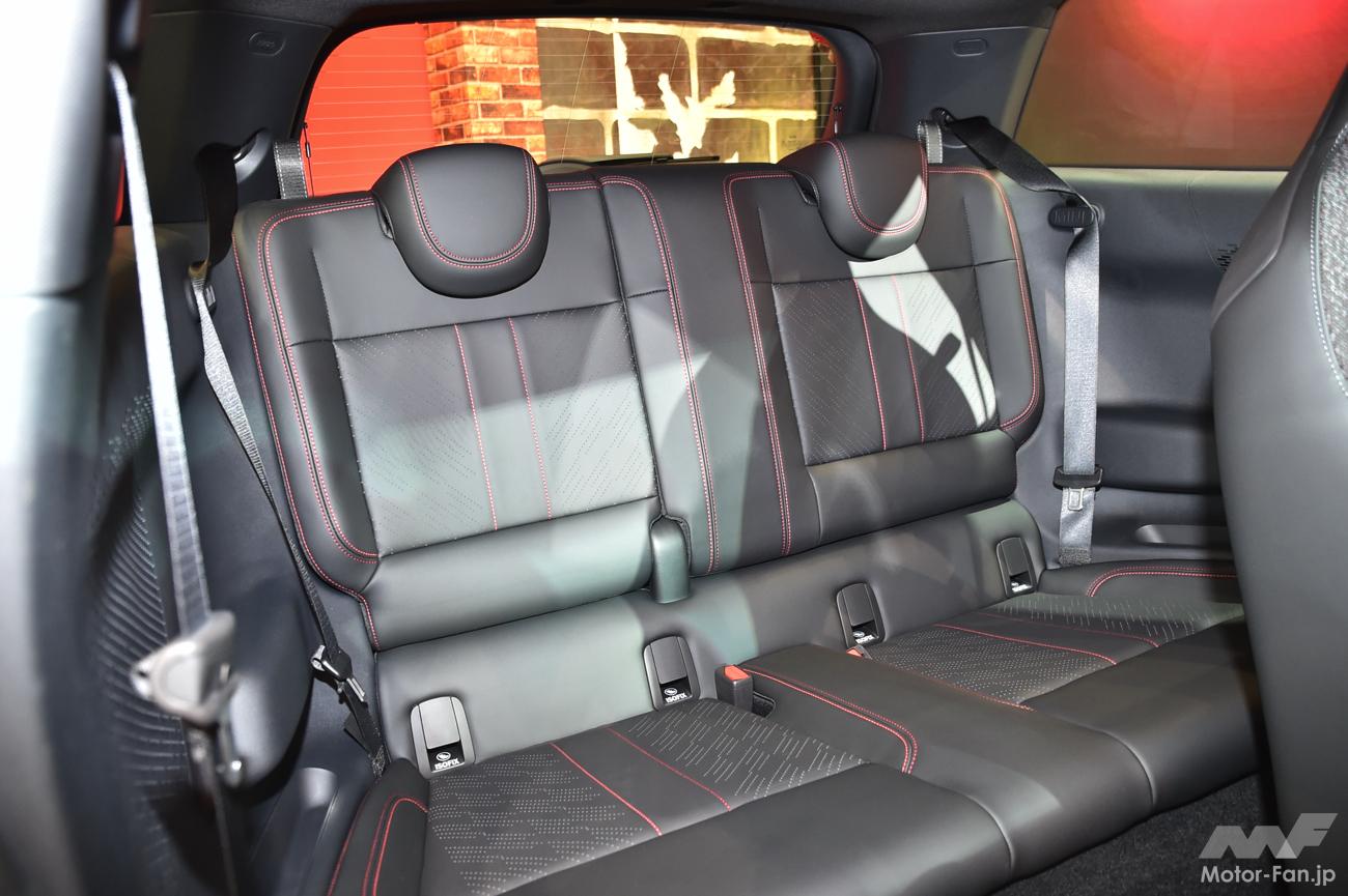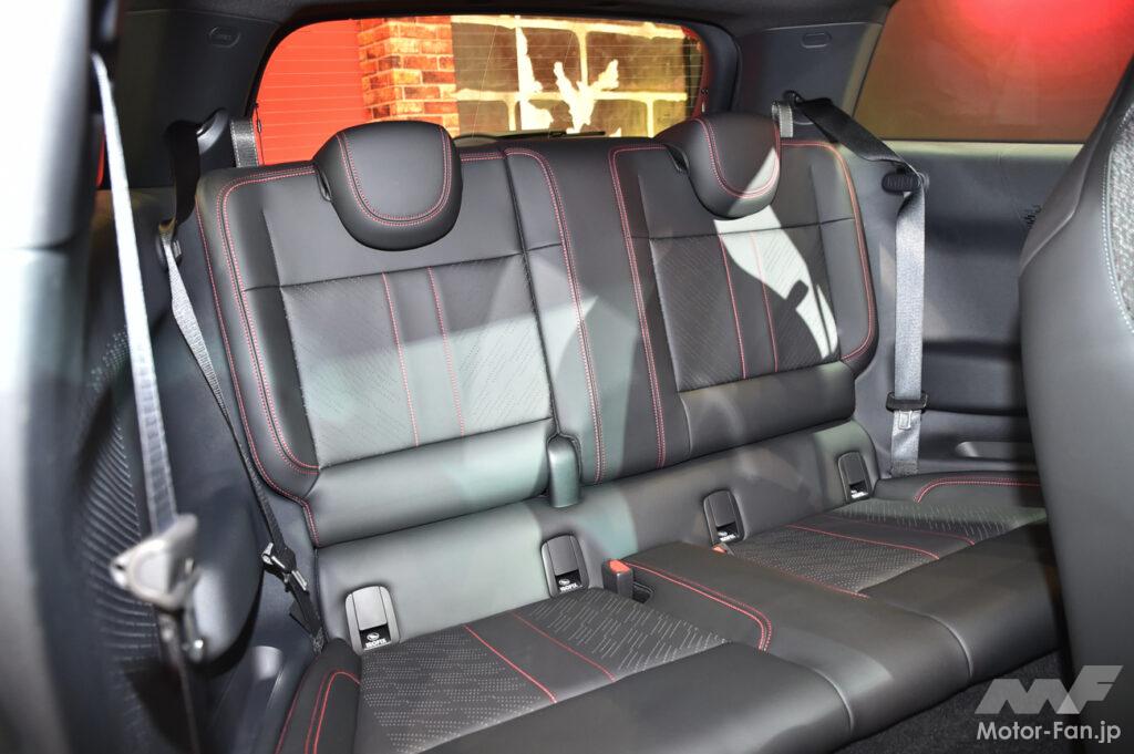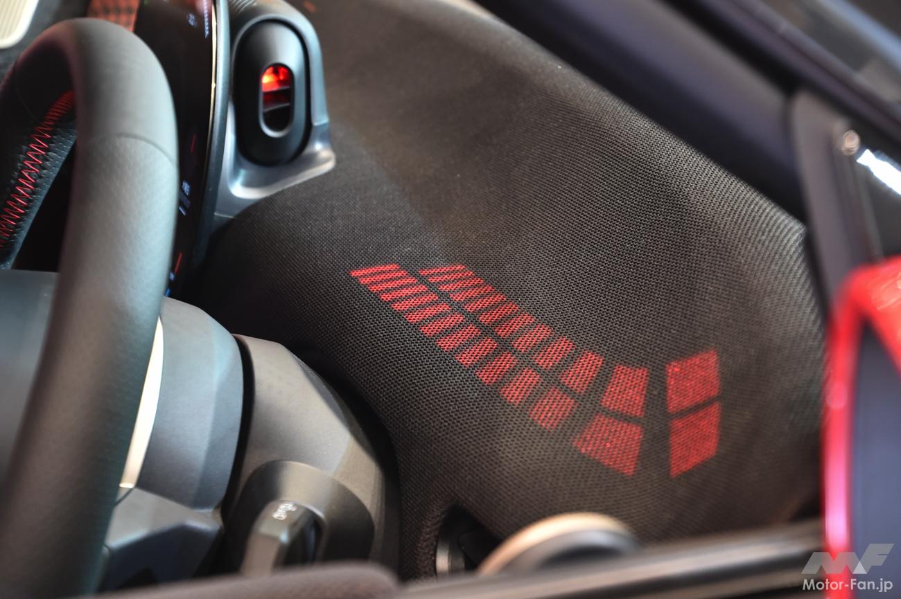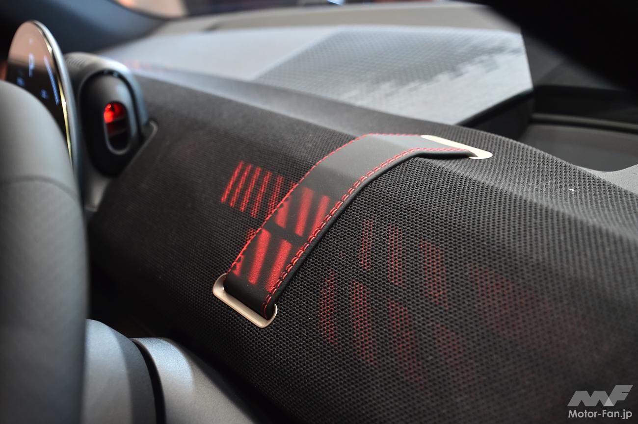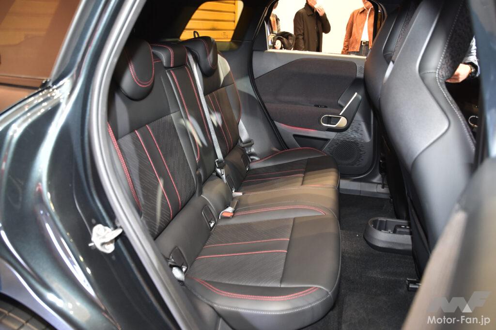 フロントシートもベスキン/コードのコンビネーションにレッドステッチ、ヘッドレスト部にレッドのラインが入るJCW用シートを装備。なお、JCW Eは他の3ドアモデルと同様に、リヤシートは2名掛けで乗車定員は4名だ。