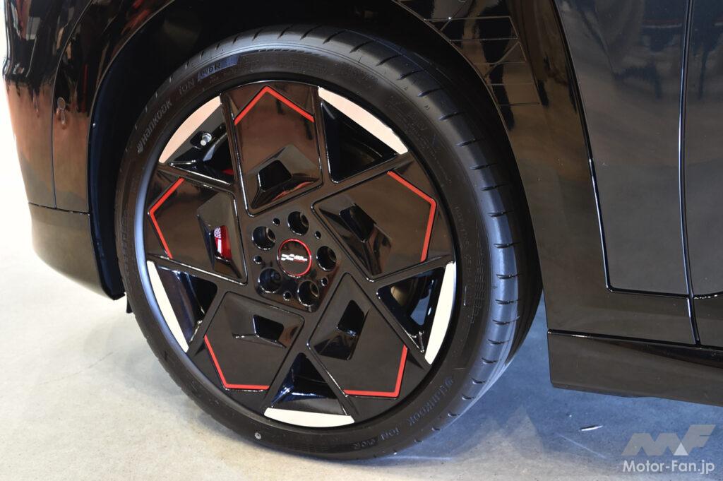 ホイールはJCW E同様に空力を重視したフラットなデザインだが、JCWエースマンEの専用モデルになっており、JCW Eのスクエアデザインに対し太めの5本スポークのペンタゴナルデザイン。チェッカーパターンは入らず、レッドのラインがアクセントになっている。