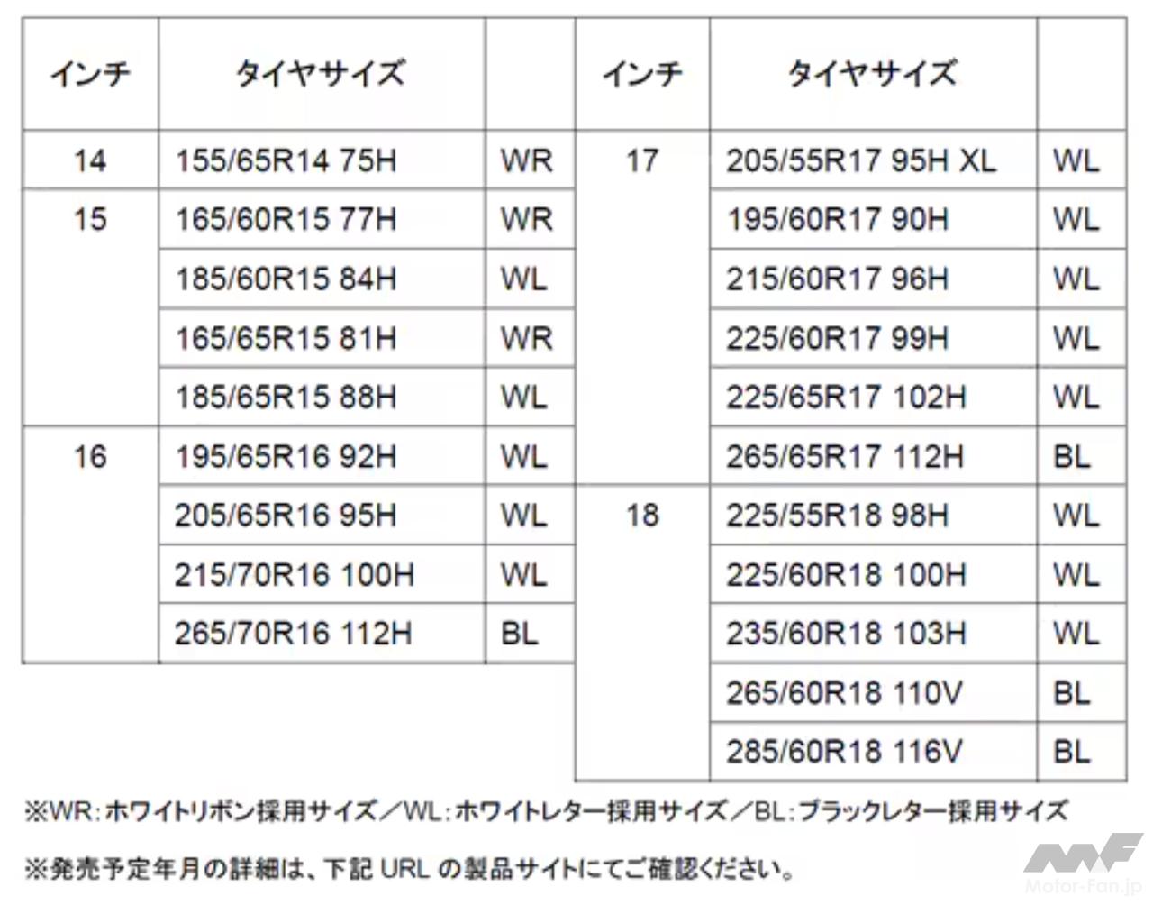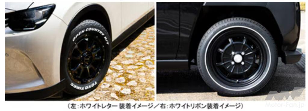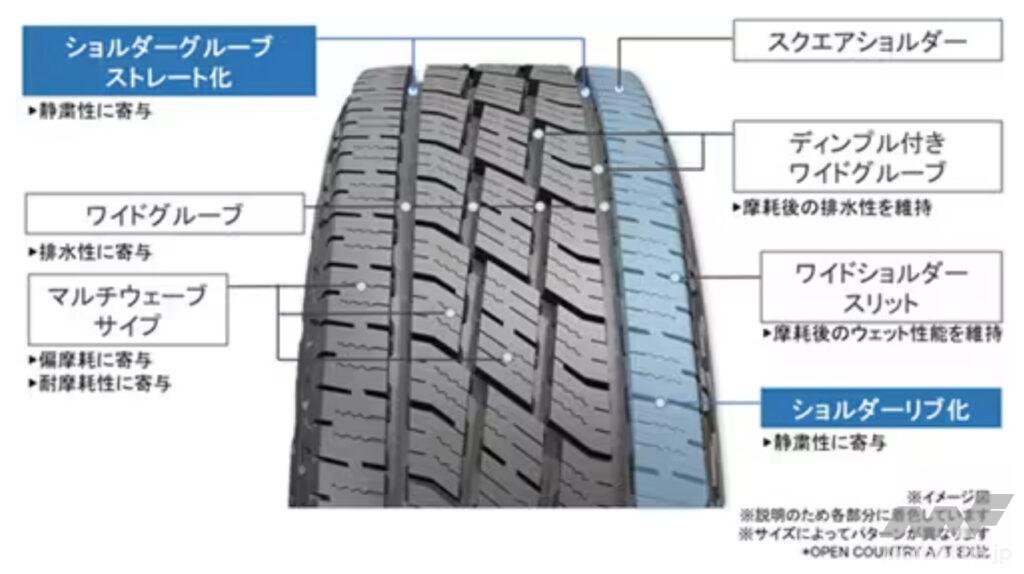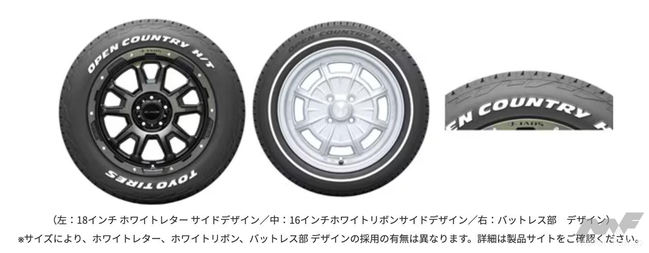 このほか、サイド部に表記するブランド名や商品名を白い文字で立体的に浮き立たせた「ホワイトレター」を採用するほか、軽自動車用サイズでは、タイヤのサイド部に沿ってリボン状に白色のラインを立体的に浮き立たせる「ホワイトリボン」を、オープンカントリー・シリーズとしては初めて採用。さらに、バットレス部(※)には意匠性の高いパターンを施すなど、細部までデザインにこだわっているのも特徴だ。