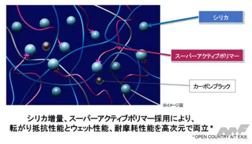 ゴム材料においては、同社独自の材料設計基盤技術「Nano Balance Technology(ナノバランステクノロジー)」を活用し、ゴム強度を向上させるシリカを増量するとともに、その分散性を高めるスーパーアクティブポリマーを採用することで配合設計を最適化。その結果、転がり抵抗性能が「オープンカントリーA/T EX」比で17%向上している。