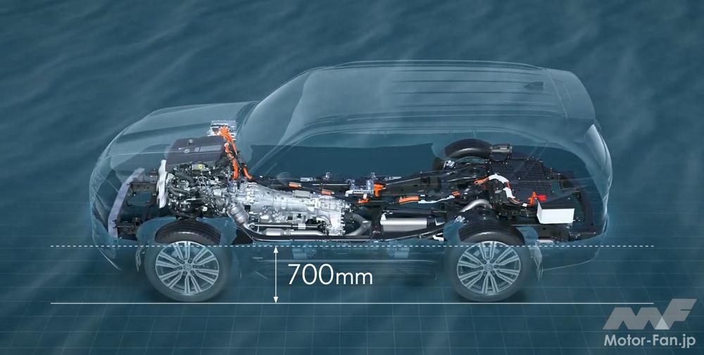 深水路などでの水の侵入を防止することで、エンジン車同等の渡河性能700mmを確保。万が一防水トレイに水が浸入した際にはトレイ内に配した被水センサーが検知、メーター表示でドライバーへの注意喚起を行う。これも単なるハイブリッド化にとどめてはいけない、ランクルベース車ならではの配慮だ。