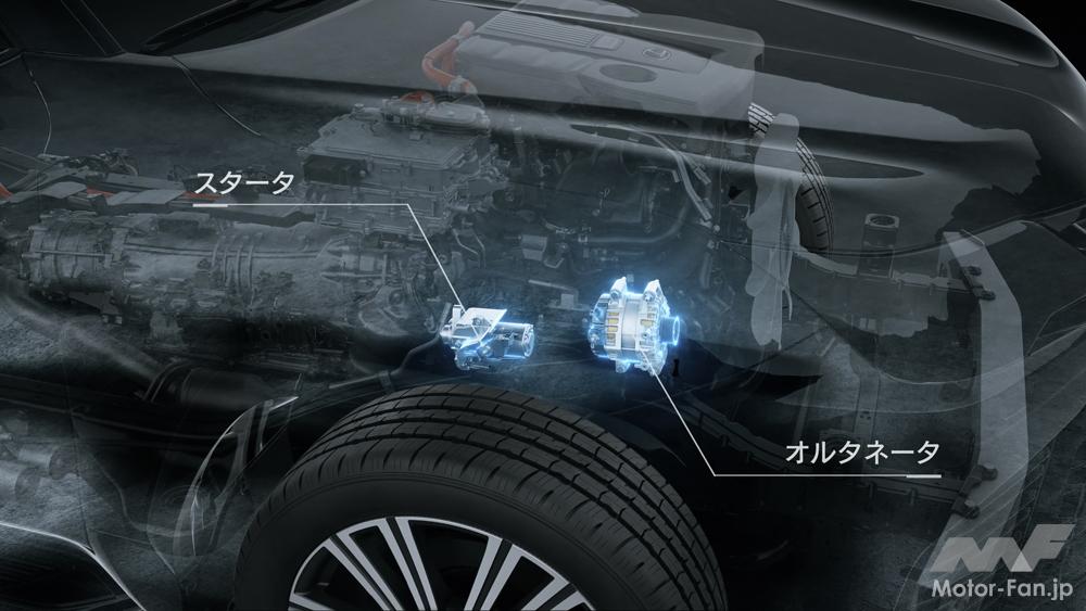 万一、ハイブリッドシステムが停止した際にもスタータでのエンジン始動が可能、オルタネータで発電した電気を12V補器バッテリーに供給することで、エンジンのみでの退避走行を可能とした。