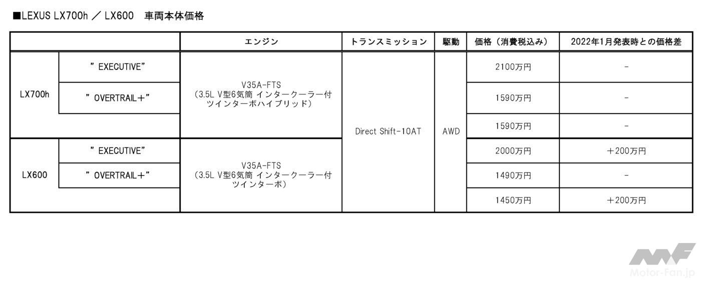 在来からの続投となる「LX600 “EXECUTIVE”」と標準の「LX600」の2機種は、それぞれ200万円の値上げ幅だ。