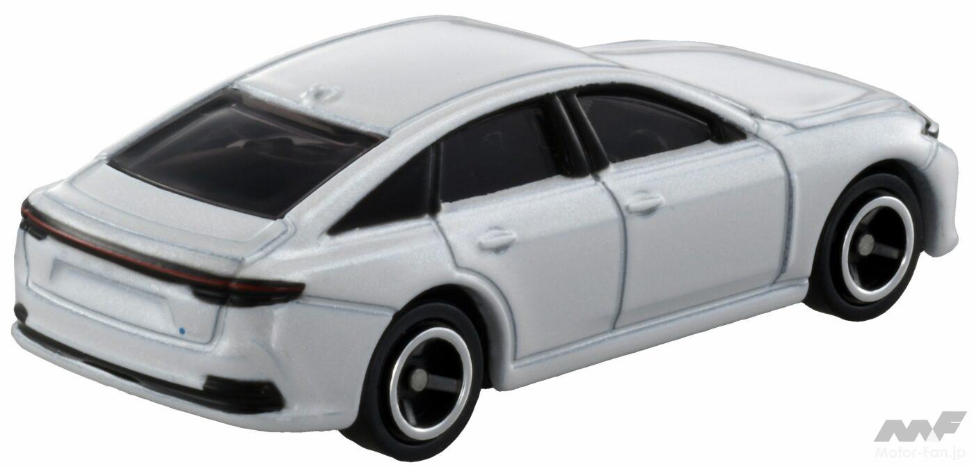 クラウン セダンは、伝統と革新を融合させたトヨタのフラッグシップモデルとして、新時代の高級セダンの在り方を示す一台となっています。『トミカ』に加わった『No.62 トヨタ クラウン セダン』は、この“セダン”モデルの特徴を上手くとらえて再現しています。2025年3月現在、クラウンの“SUV”モデルがすでに『No.72 トヨタ クラウン』として『トミカ』デビューしていますので、2台を並べて違いを調べてみるのも面白いでしょう。また、クラウン セダンにはハイブリッド車と燃料電池車がありますが、ハイブリッド車はリヤの右下に“HEV”と書かれたエンブレムが入り、燃料電池車はリヤのハイブリッド車と同じ位置と両サイドに“FCEV”と書かれた燃料電池車専用エンブレムが入って、これが外観から両者を見分ける手段になっています。『トミカ』ではリヤの右下にのみエンブレムが入っていますので、ハイブリッド車をモデル化しているようです。