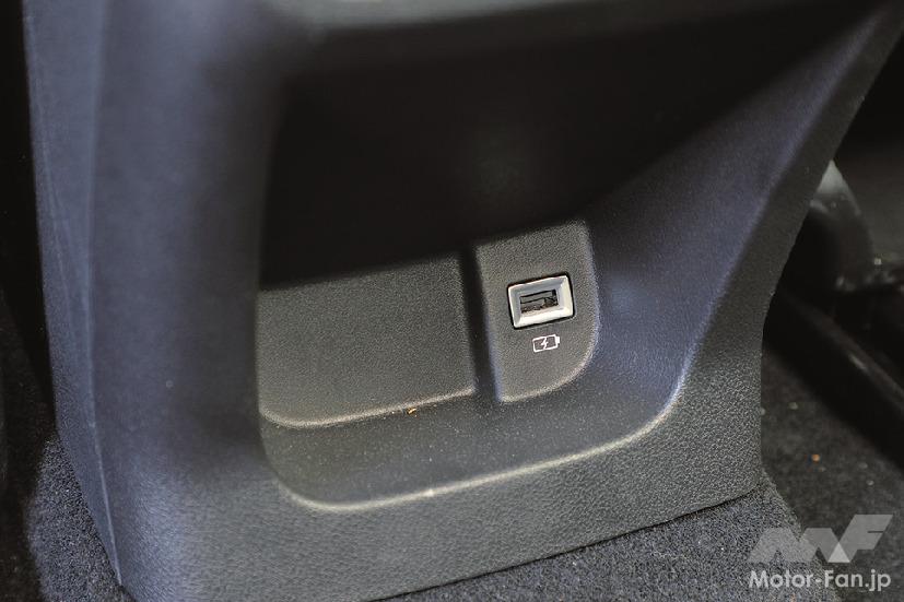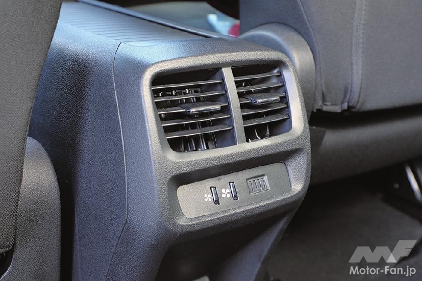 続いて、2列目座席。3席独立型で、着座スタイル的には背筋をきっちり伸ばして座るようなタイプとなるが、ステッチ入りのデニム生地のような見た目はキュートだし、前席背もたれにはテーブルも用意されるほか、電源&エアコン吹き出し口もきちんとあったりして、しっかり過ごせる仕様となっている。そして、ラゲッジスペースはかなり広い。バックゲートは、ガラスハッチだけでも開閉できるタイプなので、狭い場所でもアクセス可能だ。トノボードも折り畳み式なので、ガラスハッチのみの開閉でも荷物は取れるし、またトノボードは上下2段階に設置することができるので、荷物の量や質に合わせて設定できてフレキシブル性も高い。