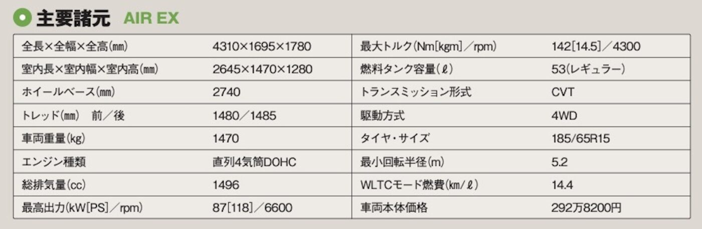 ハイブリッドがi-DCDからe:HEVに換装されたのが大きな変更点で、ユニットを収めるため全長が45㎜伸びたものの、もち前の取り回しの良さと十分な広さを確保した室内空間を受け継いでいる。上質でシンプルなデザインのスタンダードモデルとなる「エアー」に対し、非日常性やワクワク感を追求した「クロスター」は、力強く遊び心にあふれるデザインと、それぞれわかりやすく個性を際立たせている。